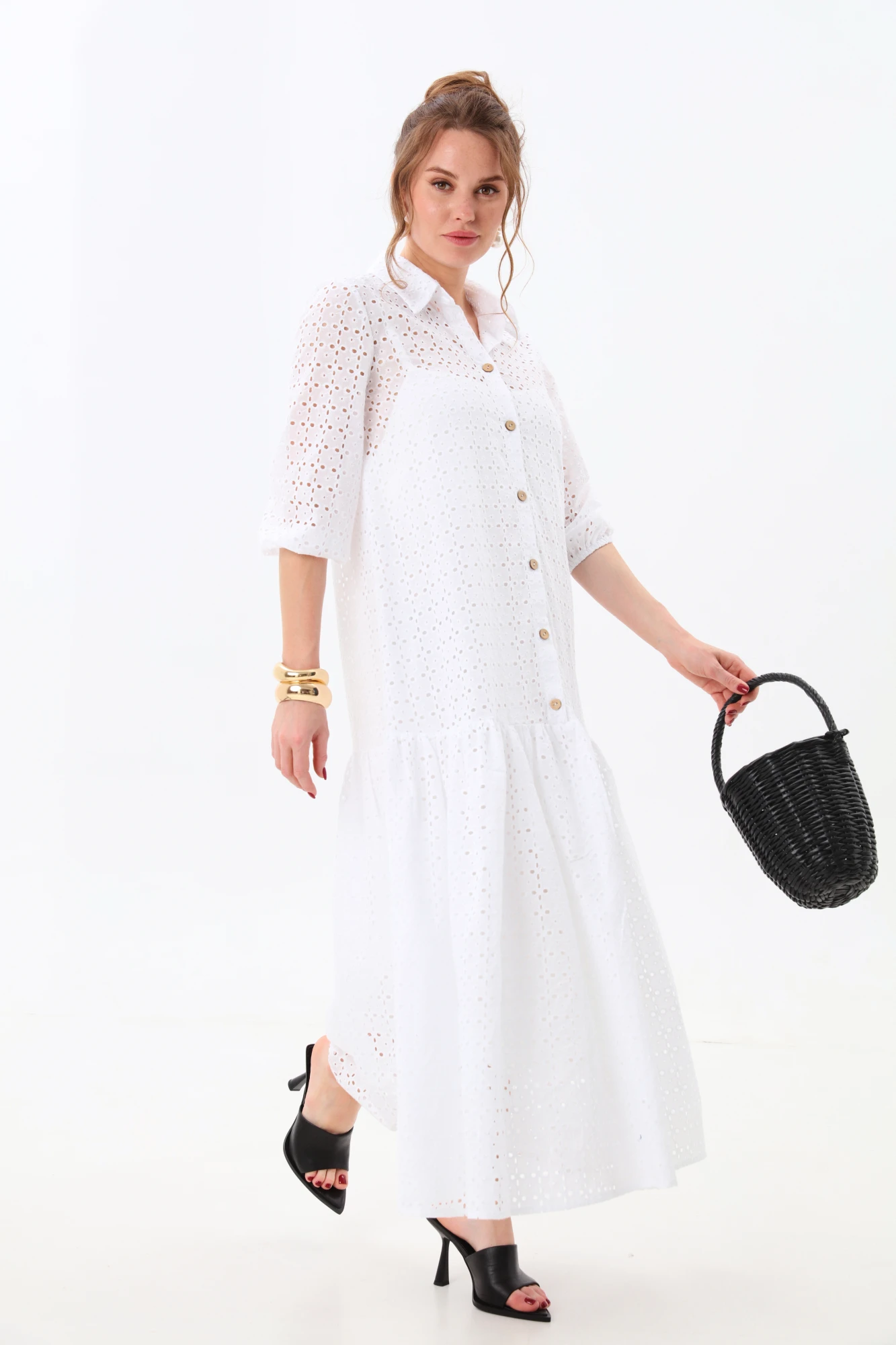 Платье состоит из двух платьев: нижнего и верхнего. Верхнее платье макси прямого свободного силуэта с воланом по низу изделия. Рукав втачной. Горловина обработана плосколежащим воротником. Центральная застёжка на петли и пуговицы. Нижнее платье комбинация на регулируемых бретелях.