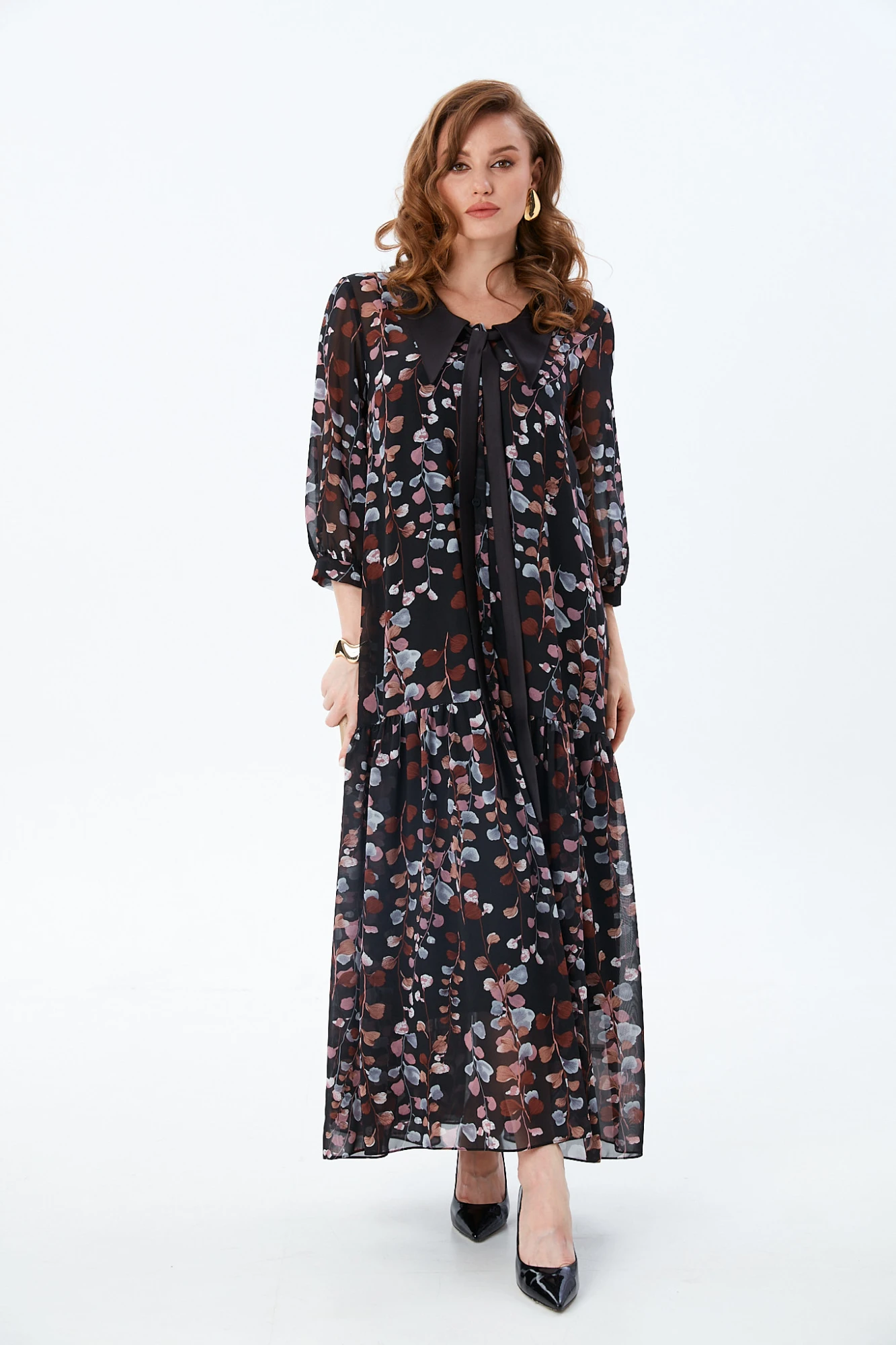 Платье состоит из двух платьев: нижнего и верхнего. Верхнее платье макси прямого свободного силуэта с воланом по низу изделия. Рукав втачной с притачным манжетом. Горловина обработана плосколежащим воротником из отделочной ткани фигурной формы. Центральная застёжка на петли и пуговицы. Нижнее платье комбинация на регулируемых бретелях.