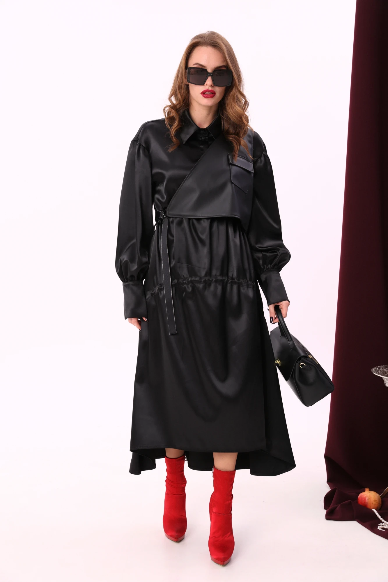Платье прямого свободного кроя длиной миди, отрезное выше линии талии с двумя настрочными фигурными кулисами по переду и спинке. В кулисы вставлена шляпная резинка с фиксаторами по бокам. Воротник стояче-отложной рубашечного типа. Центральная застёжка на петли и пуговицы. Рукав втачной со сборкой по окату. Фигурная линия низа. В комплект входит деталь, имитирующая жилет. Фиксируется на декоративную тесьму и полукольца. Фурнитура может отличаться от фото.