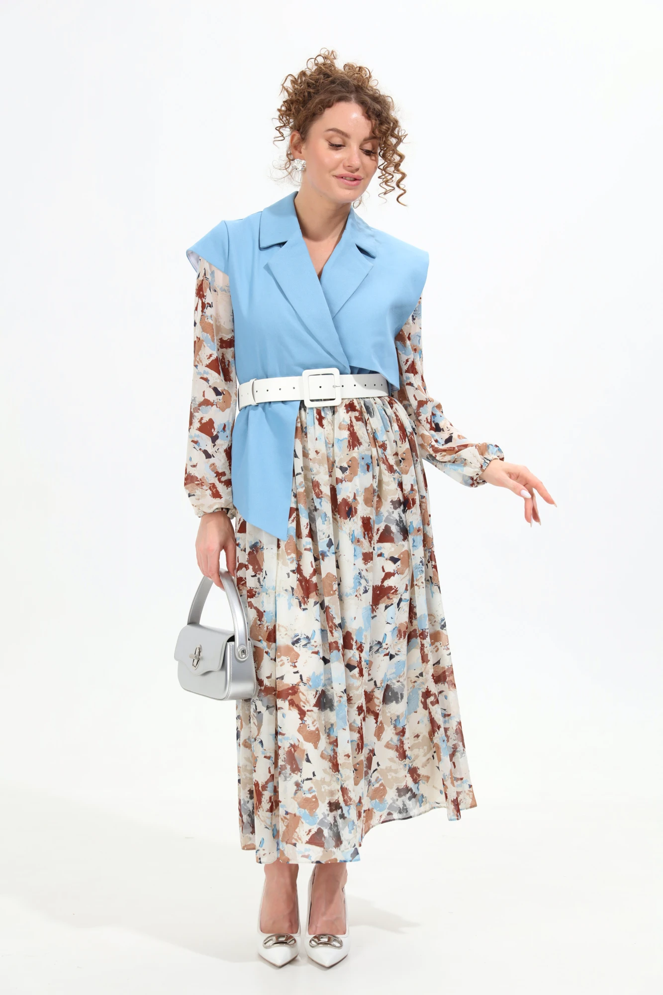 Платье комбинированное, состоящее из основной ткани и отделочной. Имитация верхнего жилета из денима прямого силуэта с воротником пиджачного типа. По правой пройме переда расположена фигурная деталь "крылышко". Спинка со средним швом. По низу правого переда и низу правой спинки фигурная деталь. По левой части переда и левой части спинки отлетная кокетка. Рукава одношовные, втачные, длинные со сборкой по линии низа на резинку из отделочной ткани. Юбка прямого силуэта длинная, со сборкой по талии из отделочной ткани. По линии талии платья резинка и шлевки по боковым швам и центральному шву спинки из основной ткани. В комплект к платью идёт ремень с пряжкой.