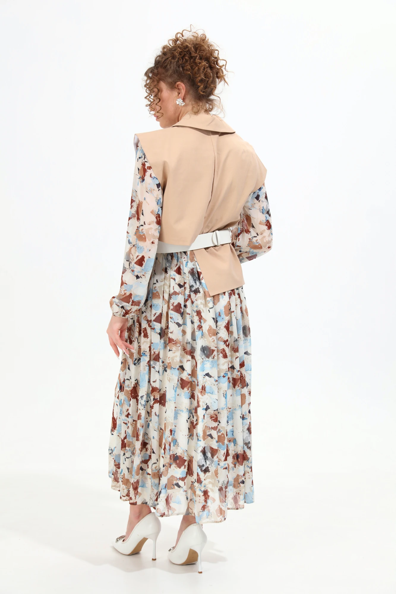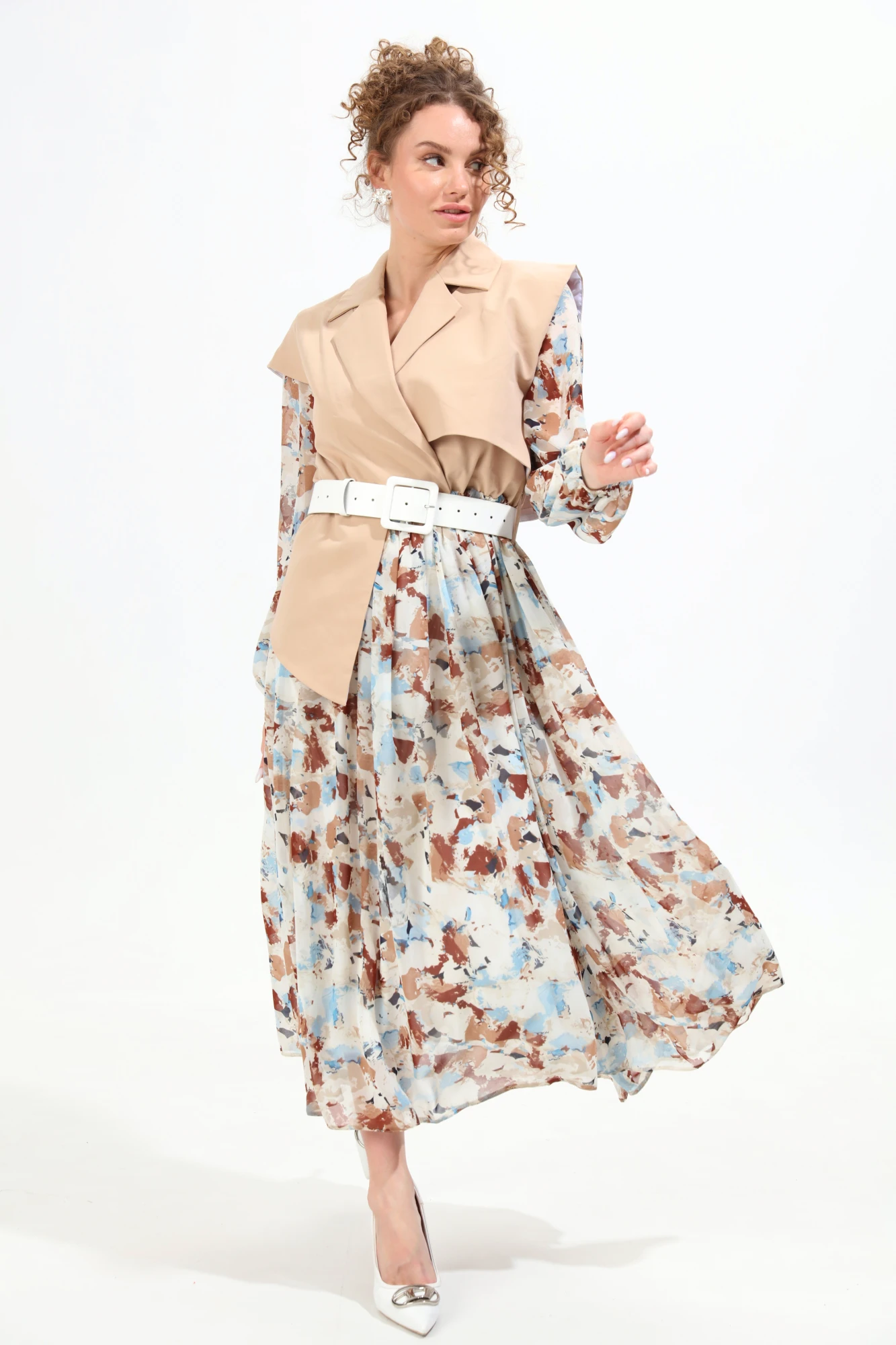Платье комбинированное, состоящее из основной ткани и отделочной. Имитация верхнего жилета из денима прямого силуэта с воротником пиджачного типа. По правой пройме переда расположена фигурная деталь "крылышко". Спинка со средним швом. По низу правого переда и низу правой спинки фигурная деталь. По левой части переда и левой части спинки отлетная кокетка. Рукава одношовные, втачные, длинные со сборкой по линии низа на резинку из отделочной ткани. Юбка прямого силуэта длинная, со сборкой по талии из отделочной ткани. По линии талии платья резинка и шлевки по боковым швам и центральному шву спинки из основной ткани. В комплект к платью идёт ремень с пряжкой.