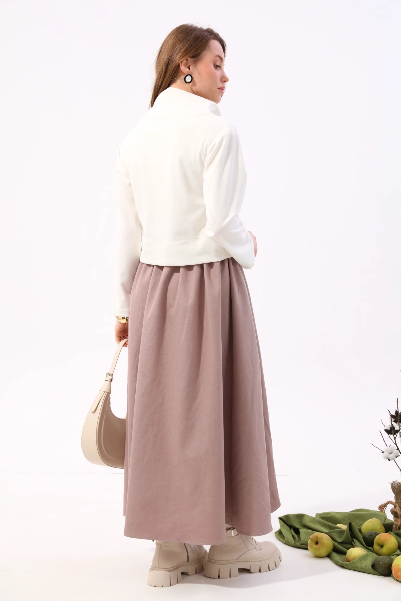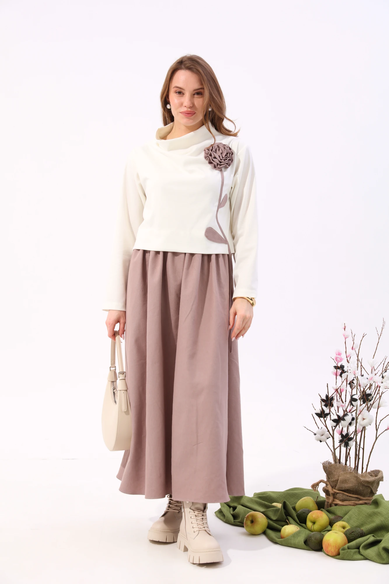 Платье прямого силуэта, состоящее из комбинации двух тканей - основной и отделочной. Воротник цельнокроеный хомут. Рукав одношовный, втачной, длинный. Нижняя юбка из отделочной ткани, со сборкой по линии талии. В виде отделки по левой части переда декоративный элемент из отделочной ткани.