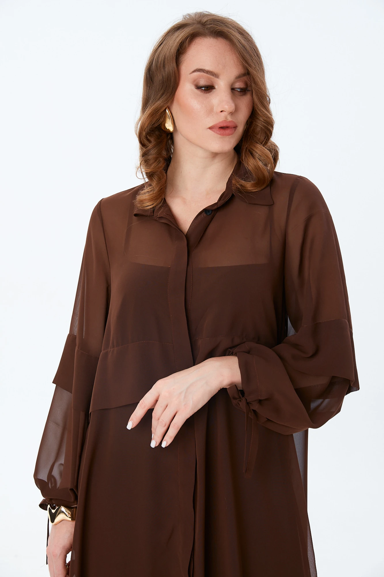 Платье состоит из двух платьев: нижнего и верхнего. Верхнее платье макси с центральной отрезной застёжкой на потайную планку на петли и пуговицы.По переду и спинке цельнокроеные складки на уровне талии. Рукав втачной,одношовный рубашечноно типа. По низу рукава пробиты петли и вставлена завязка для фиксации сборки . Воротник рубашечный стояче отложной. Нижнее платье комбинация на регулируемых бретелях.