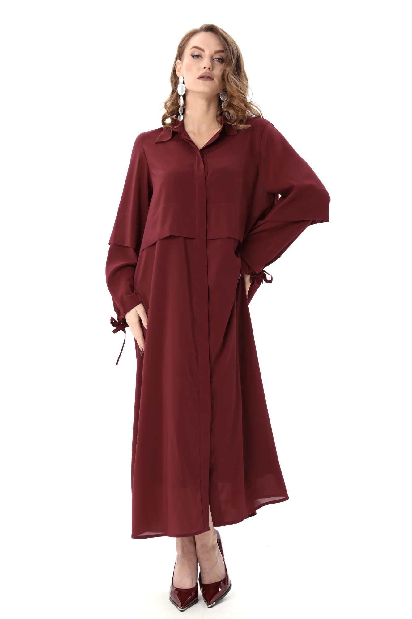 Платье макси с центральной отрезной застёжкой на потайную планку на петли и пуговицы.По переду и спинке цельнокроеные складки на уровне талии. Рукав втачной,одношовный рубашечноно типа. По низу рукава пробиты петли и вставлена завязка для фиксации сборки . Воротник рубашечный стояче отложной.