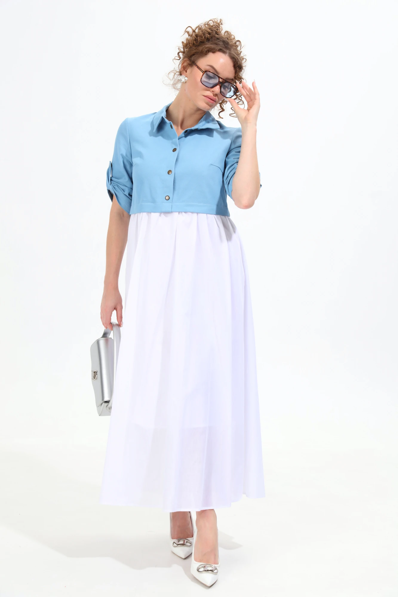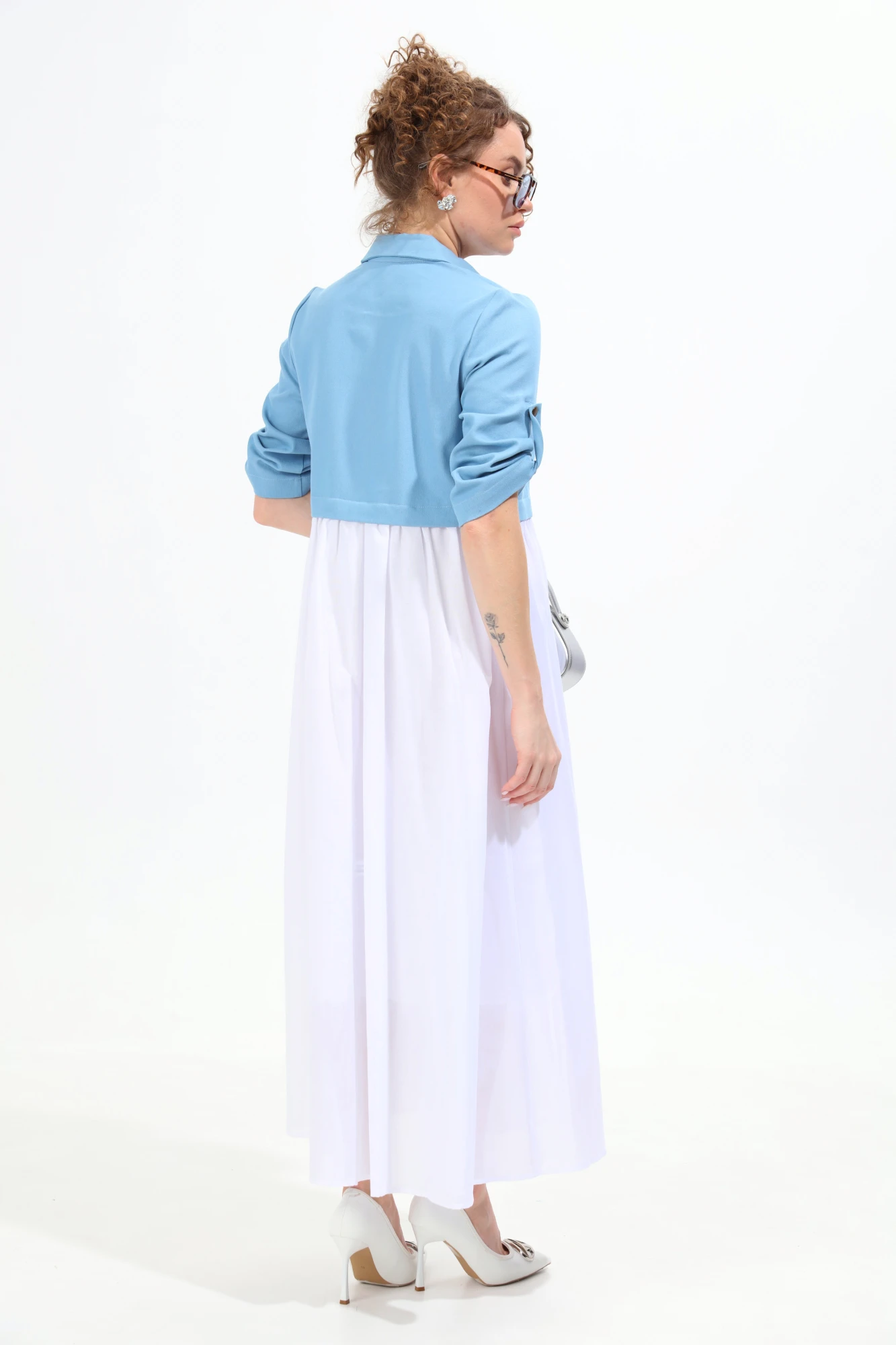 Комбинированное платье, состоящее из лифа и юбки. Лиф прямого кроя с втачным рукавом с манжетой и патой на кнопки. Горловина обработана рубашечным воротником с отрезной стойкой. Застёжка центральная на кнопки. Юбка А-силуэта на подкладке.