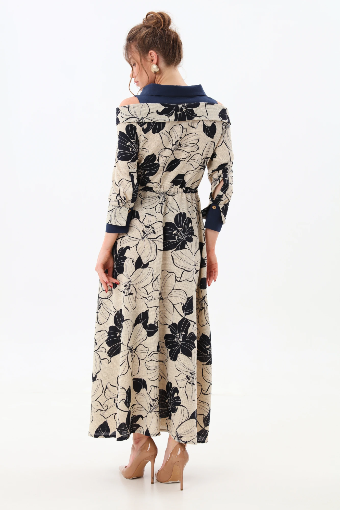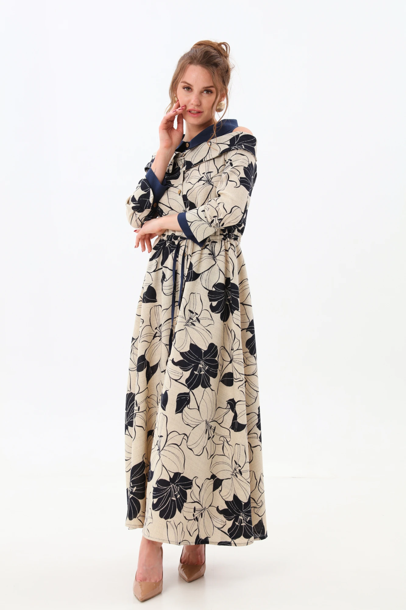 Эксклюзивное платье длиной макси полуприлегающего силуэта. Отрезное по линии талии, на кулисе. Юбка расклешена к низу. Полочка с центральной застежкой на петли и пуговицы, край борта обработан притачной планкой. Вырез горловины обработан отложным воротником со стойкой и имитацией рубашечного воротника из контрастой по цвету отделочной ткани. Рукав втачной по низу проймы. Низ рукава оформлен двойной манжетой.