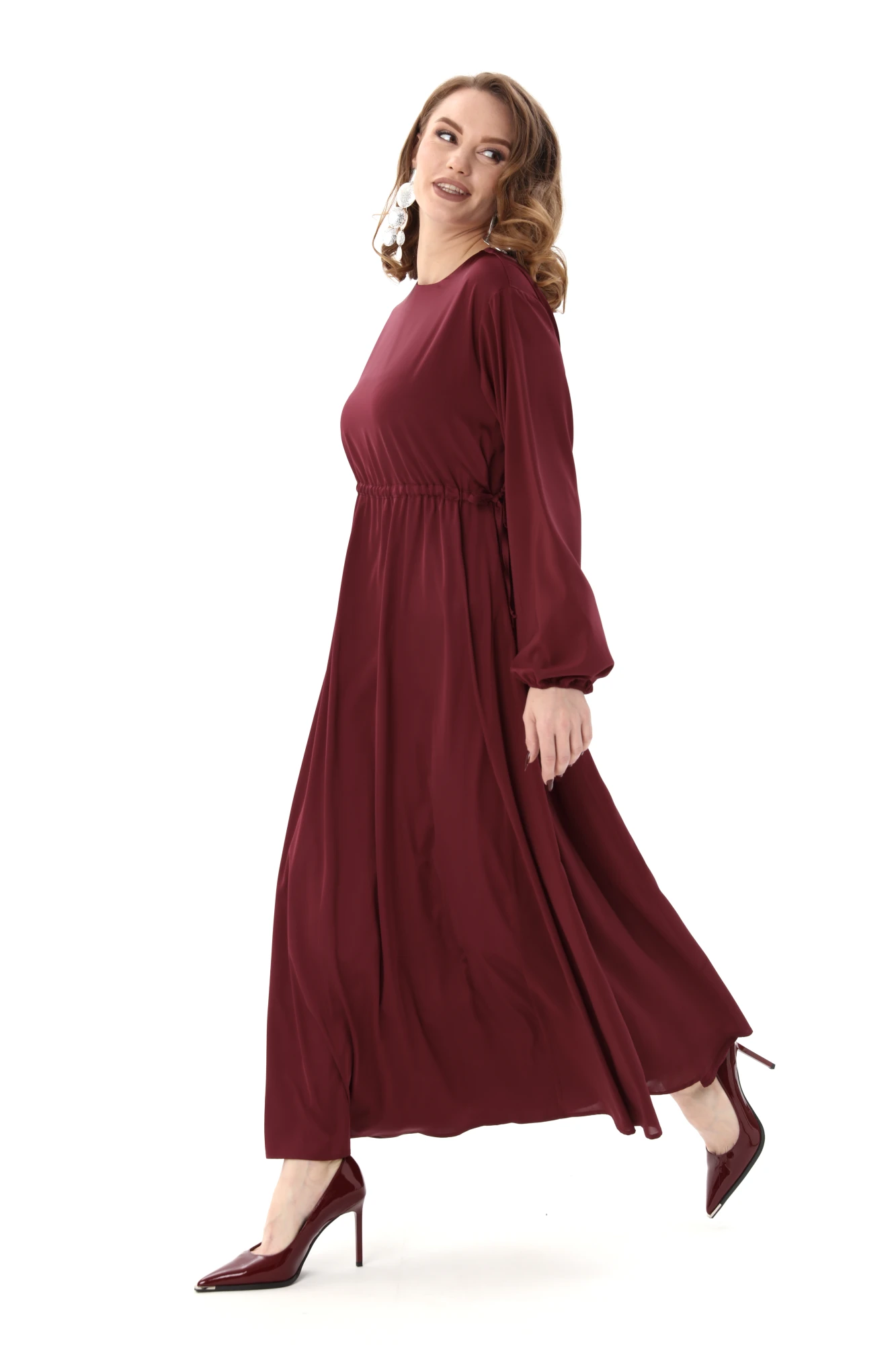 Платье длиной макси комбинированное, свободного кроя, расклешенное к низу. Перед состоит из центральной и боковой части. Спинка с притачной кокеткой, центральной и боковыми частями. На переде и спинке по линии талии настрочена кулиска, с регулировкой прилегания с помощью шнура. Рукав втачной длинный. Горловина изделия круглой формы.