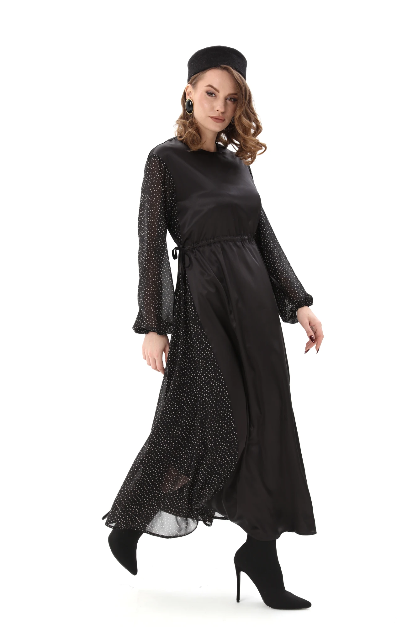 Платье длиной макси комбинированное, свободного кроя, расклешенное к низу. Перед состоит из центральной и боковой части. Спинка с притачной кокеткой, центральной и боковыми частями. На переде и спинке по линии талии настрочена кулиска, с регулировкой прилегания с помощью шнура. Рукав втачной длинный. Горловина изделия круглой формы.