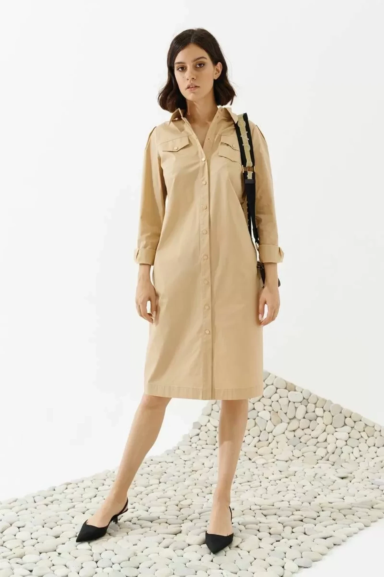 Универсальное и практичное платье-рубашка из полотна средней плотности на основе хлопка.