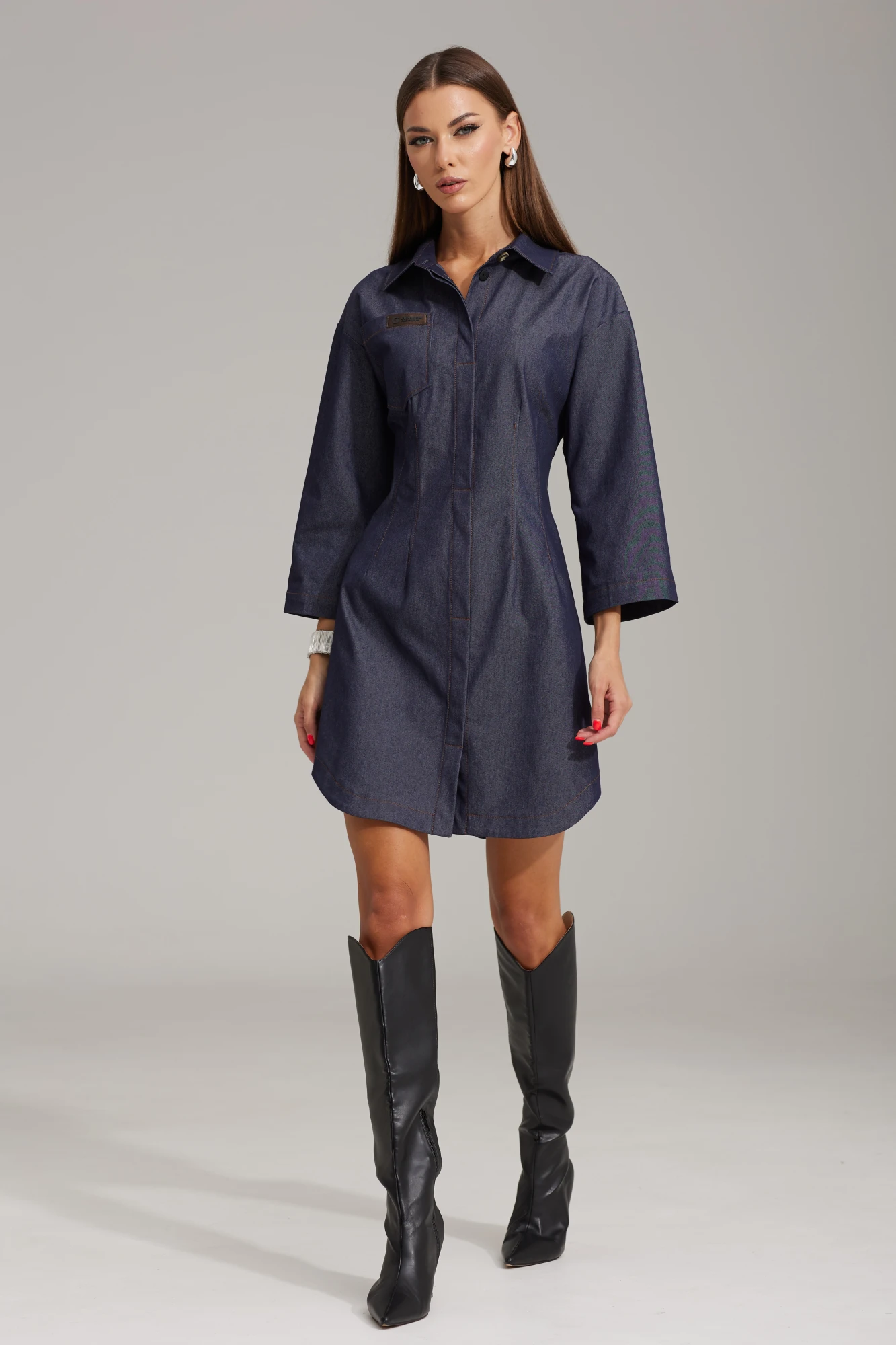 Платье полуприлегающего силуэта, выполнено из джинсовой ткани, покроя спущенное плечо, с центрально-бортовой застежкой и потайной планкой на пуговицы. Рукав одношовный, длиной 7/8, расширенный к низу. Горловина оформлена стояче отложным воротником с отрезной стойкой. С правой стороны, в области груди – накладной карман с декоративной нашивкой. На переде расположены вертикальные талиевые вытачки, отстроченные отделочной строчкой. На спинке расположены вертикальные рельефы, в которые, в области талии, вставлены петельки из основной ткани и зашнурованы шнуром, изготовленным так же из основной ткани. Низ платья фигурный, обработан обтачкой и оформлен отделочной строчкой. На планке расположены горизонтальные закрепки, низ рукавов отстрочен отделочной строчкой, а планка, воротник, карман, рельефы по спинке, вытачки по переду – контрастными нитками.