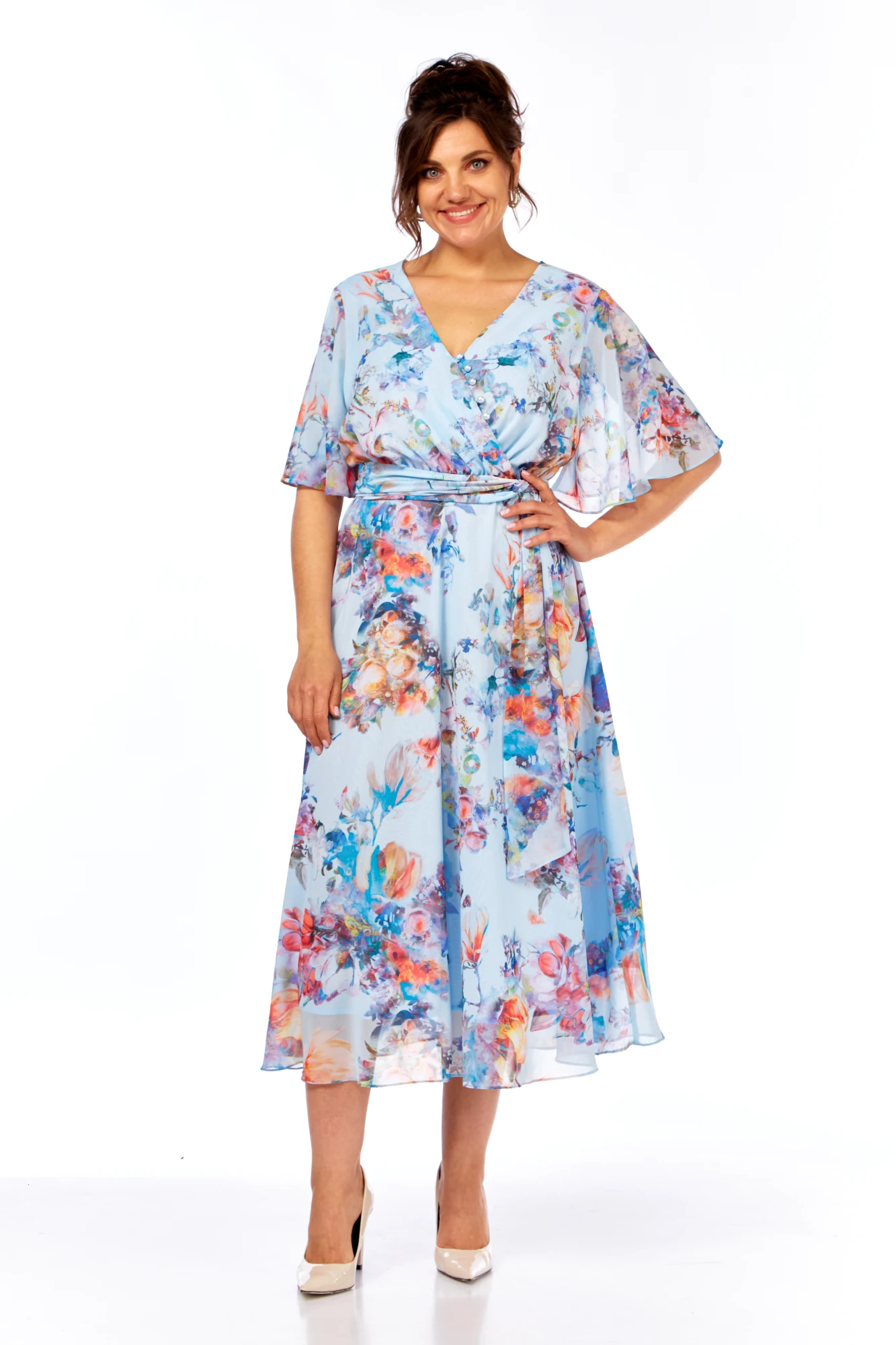 Шикарное нарядное платье, отрезное по талии. Верхняя часть на запах, с застежкой на пуговицы. Нижняя часть крой полусолнце. По талии резинка и пояс. Рукав короткий свободный. На подкладке.