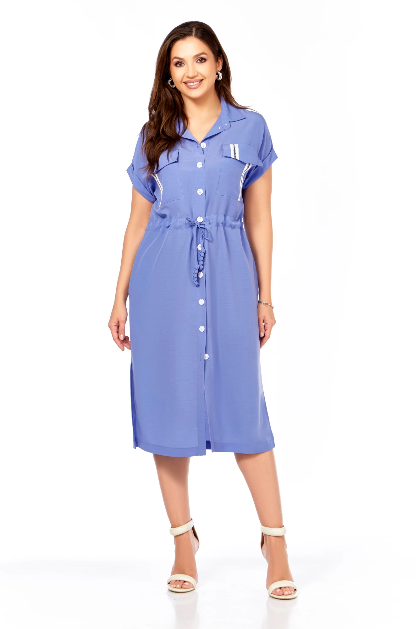 Шикарное платье-рубашка прямого силуэта с центральной застежкой на петли и пуговицы, с воротником рубашечного типа. Накладные карманы с клапанами, с декоративной тесьмой. По талии кулиска, в которую втянут шнур с интересными наконечниками ручной работы. Карманы в боковых швах. По низу разрезы по бокам. Рукав спущенный с притачными манжетами.
