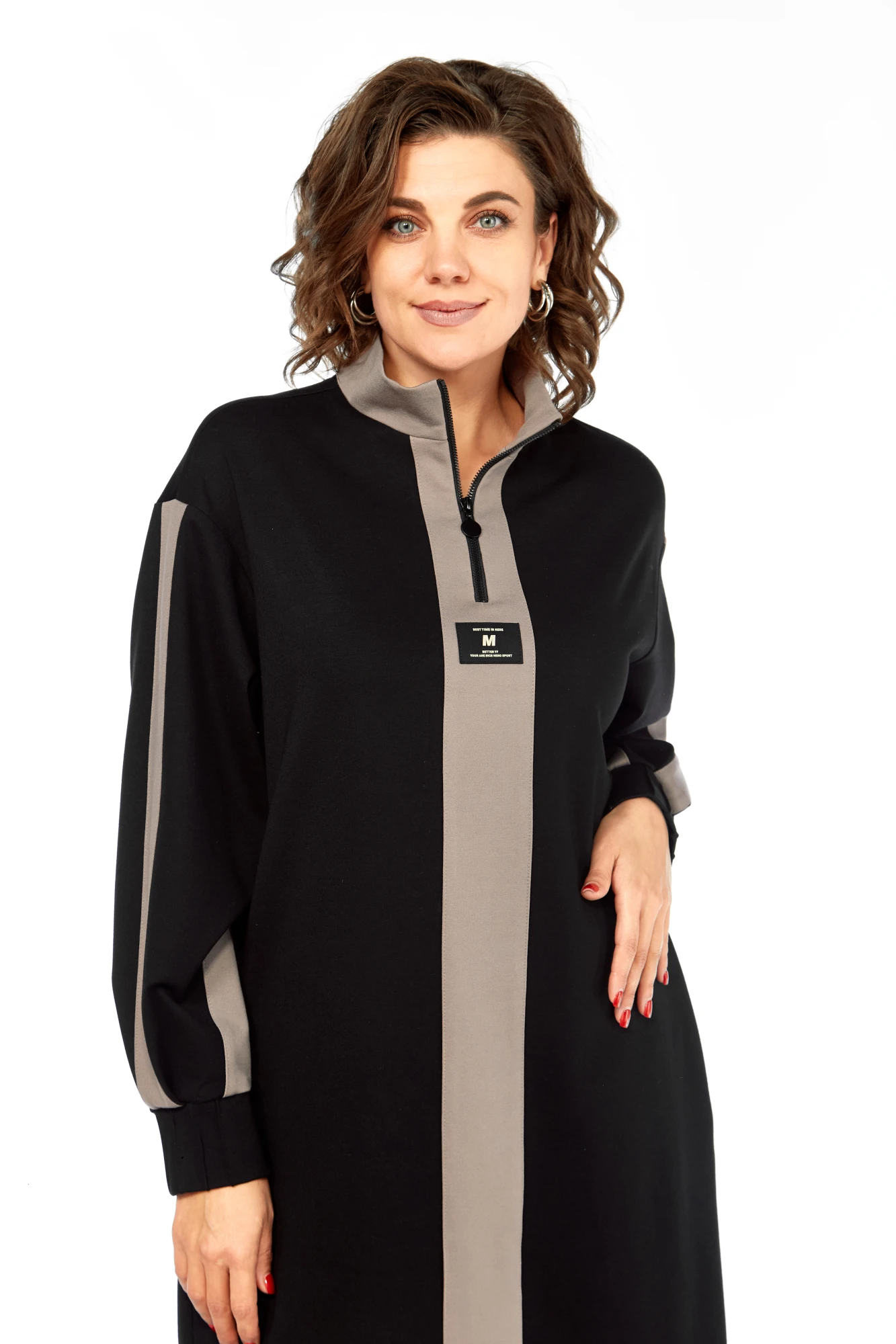 Платье в стиле спорт-шик прямого силуэта, с воротником-стойкой. По переду, по центру контрастная отделка, молния, переходящая в воротник, декоративная нашивка. В боковых швах карманы и разрезы в низу. Рукав апущенный на манжете, с контрастными полосками.