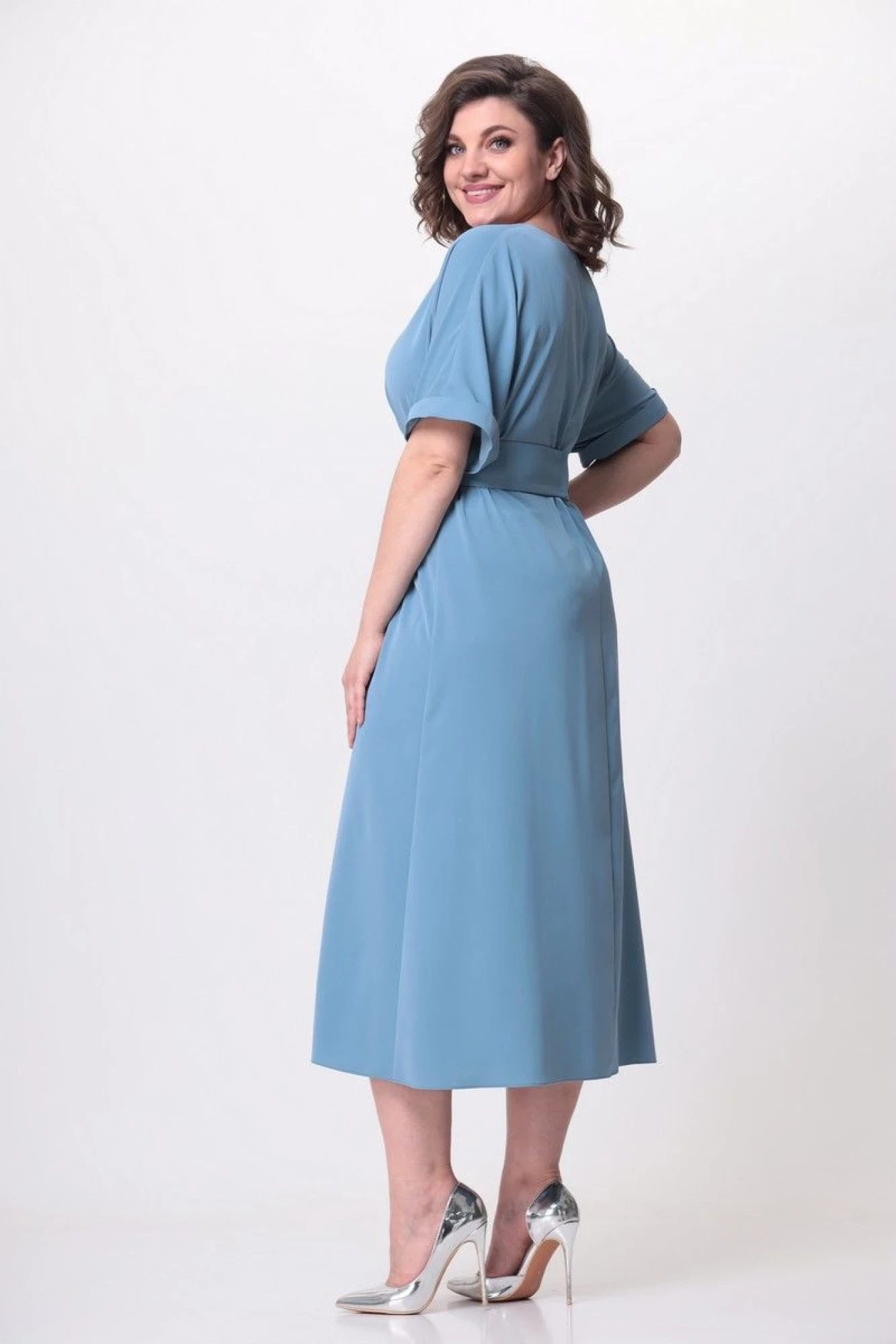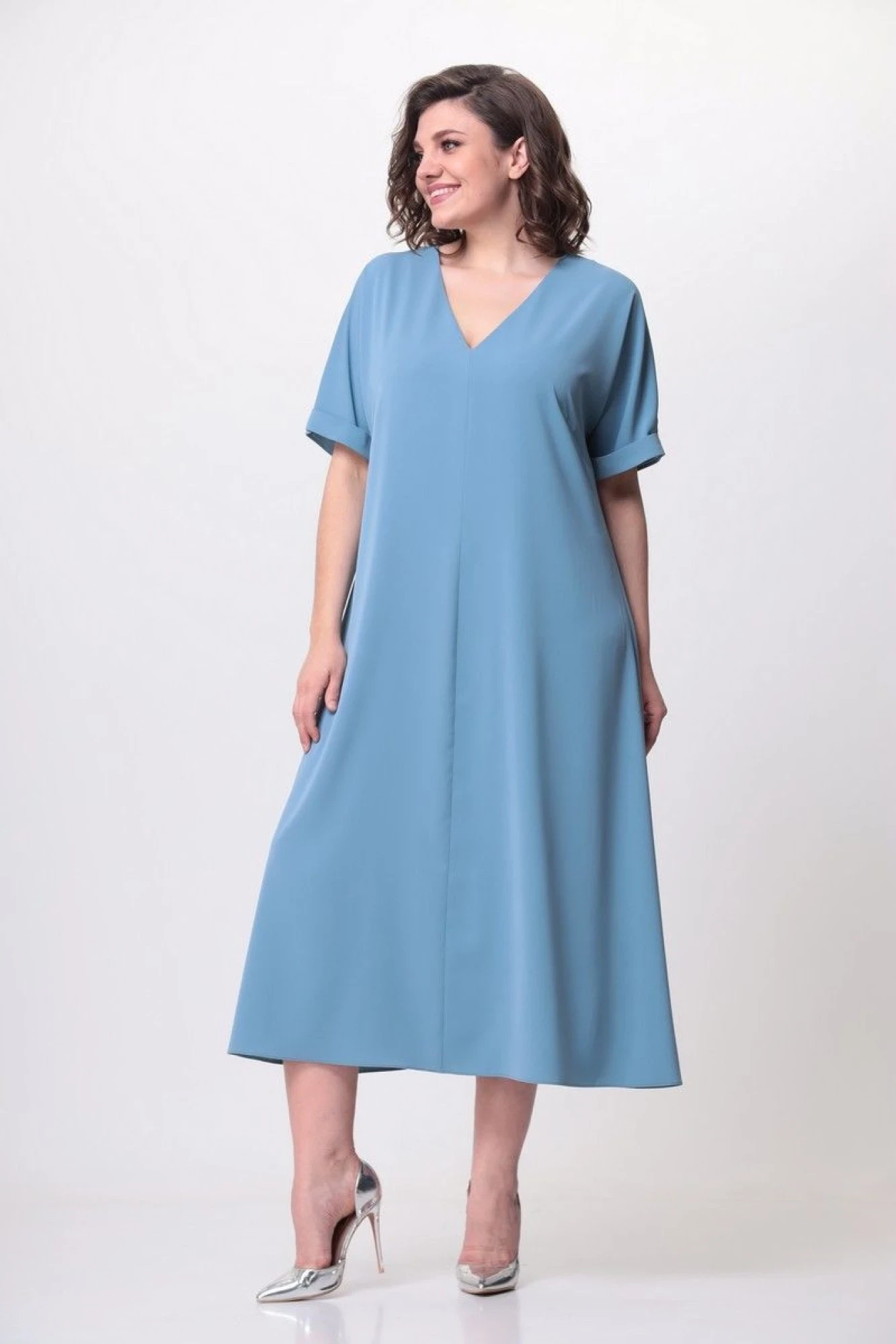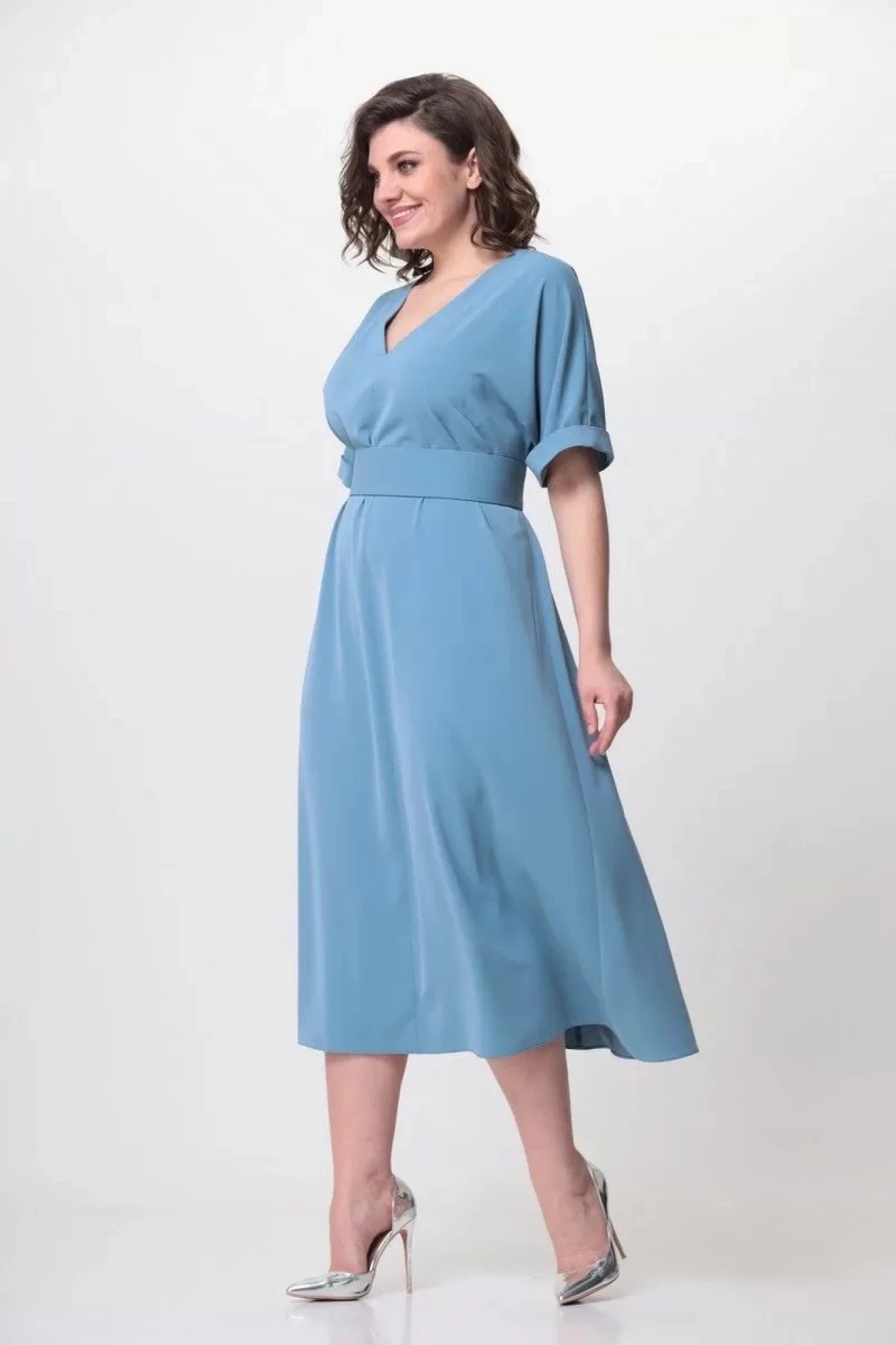 Платье женское А-образного силуэта (расширенное к низу), цельнокроеное. Горловина «V»-образной формы. Платье выполнено из струящейся ткани. По переду расположены нагрудные вытачки идущие из бокового шва. Также по переду средний шов. По спинке средний шов. Платье удлиненное. Длина рукава до локтя. Дополнение к платью служит пояс, фиксирующийся на пришивные кнопки.