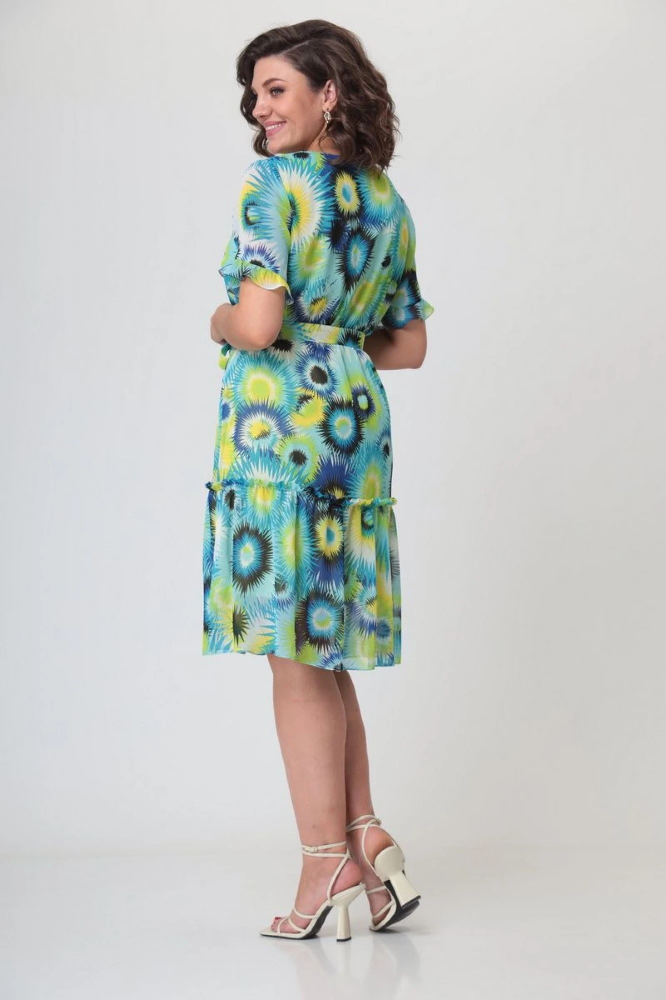 Платье втачного покроя, рукава короткие одношовные, низ оформлен воланом со сборкой. Спинка цельная с настрочным воланом с оборкой по верхнему срезу волана.
