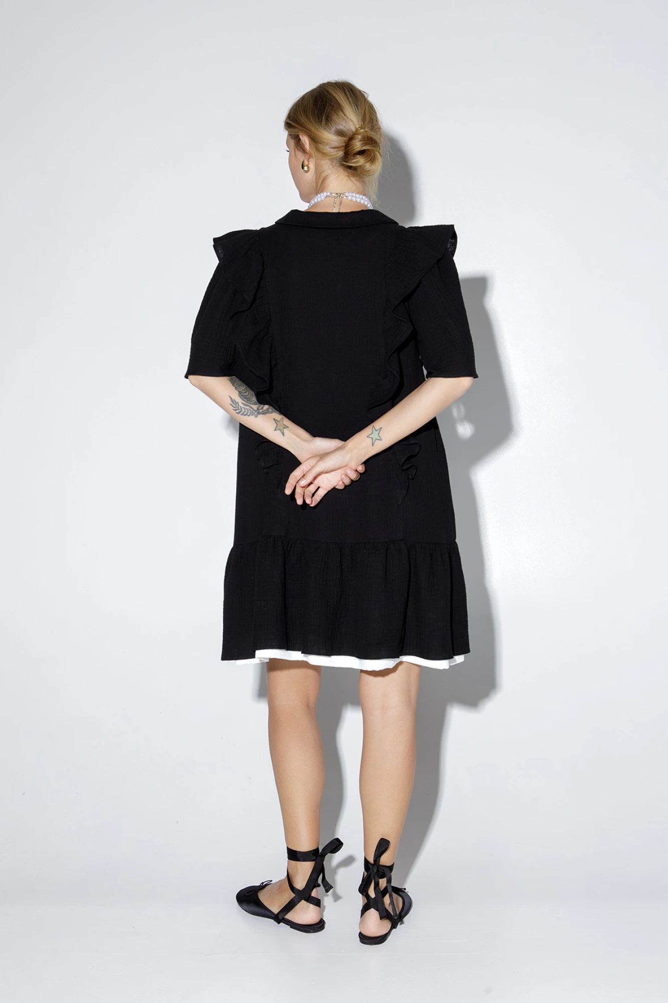 Свободное платье с акцентным воротником и контрастной отделкой из облегченного хлопка. Детали: трапециевидный силуэт, отложной воротник, застежка на петли и декоративные пуговицы, рукава пышные короткие Длина по спинке около 84 см в размерах 40-46 и около 87 см в размерах 48-52
