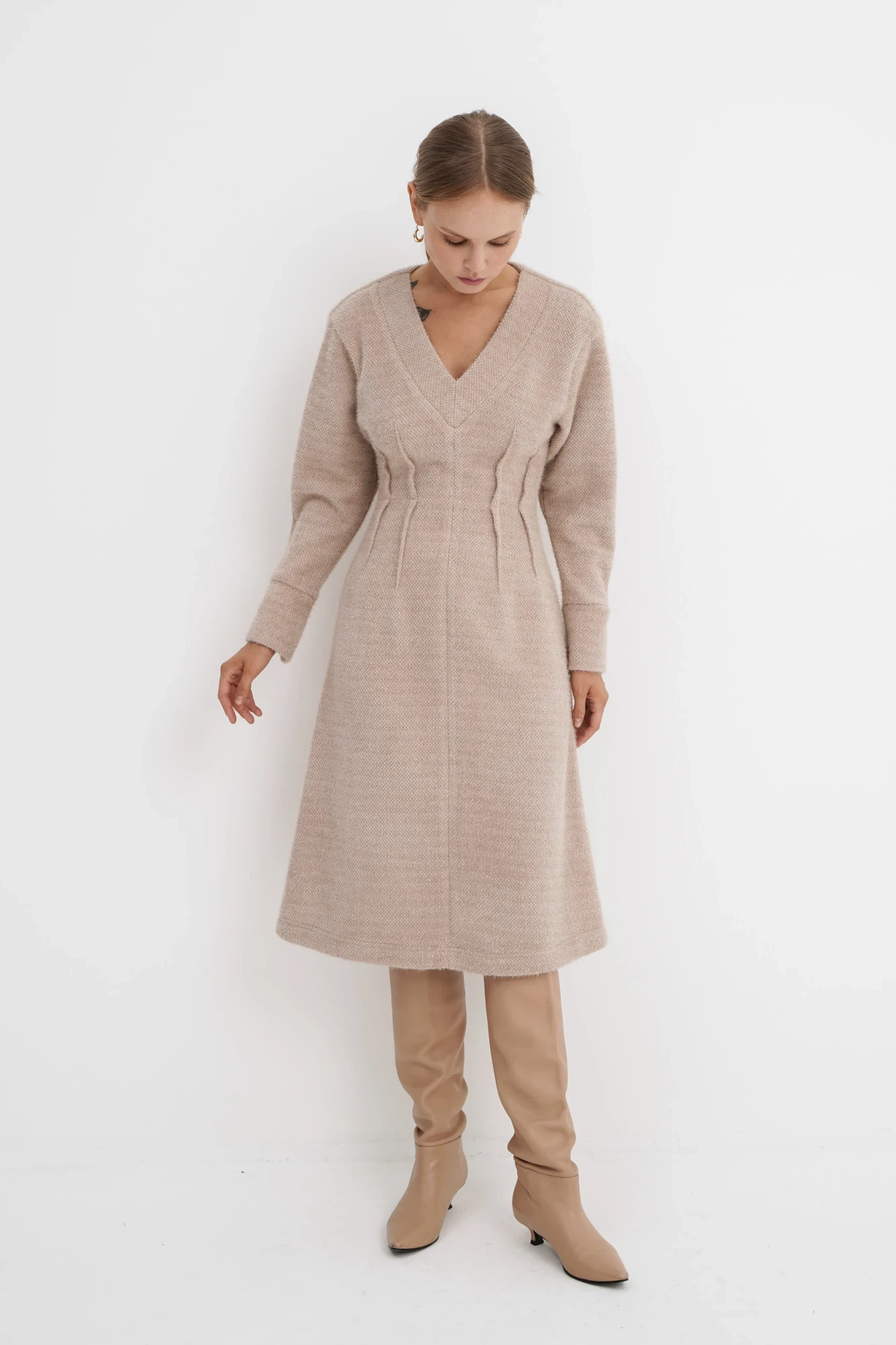 Платье Х-образного силуэта из плотного трикотажного полотна. Детали: спущенная линия плеча и углубленная пройма, V- образный вырез горловины переда, перед и спинка с талиевыми вытачками, рукава втачные длинные с притачными манжетами, потайная застежка-молния в среднем шве спинки. Длина платья по спинке около 103,5 см, длина рукава+ плечо около 53,5+7,5 см.