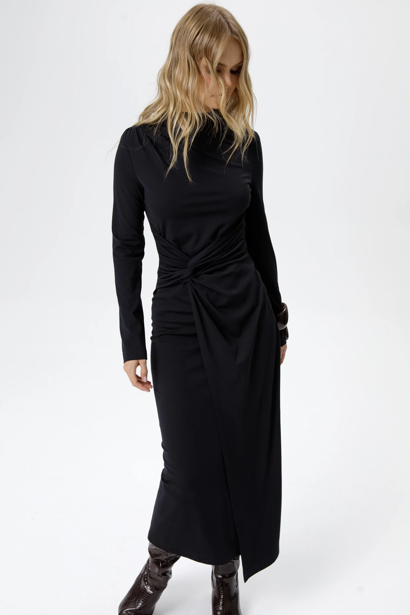 Трикотажное платье длины миди с ассиметричным запахом и декоративным узлом.