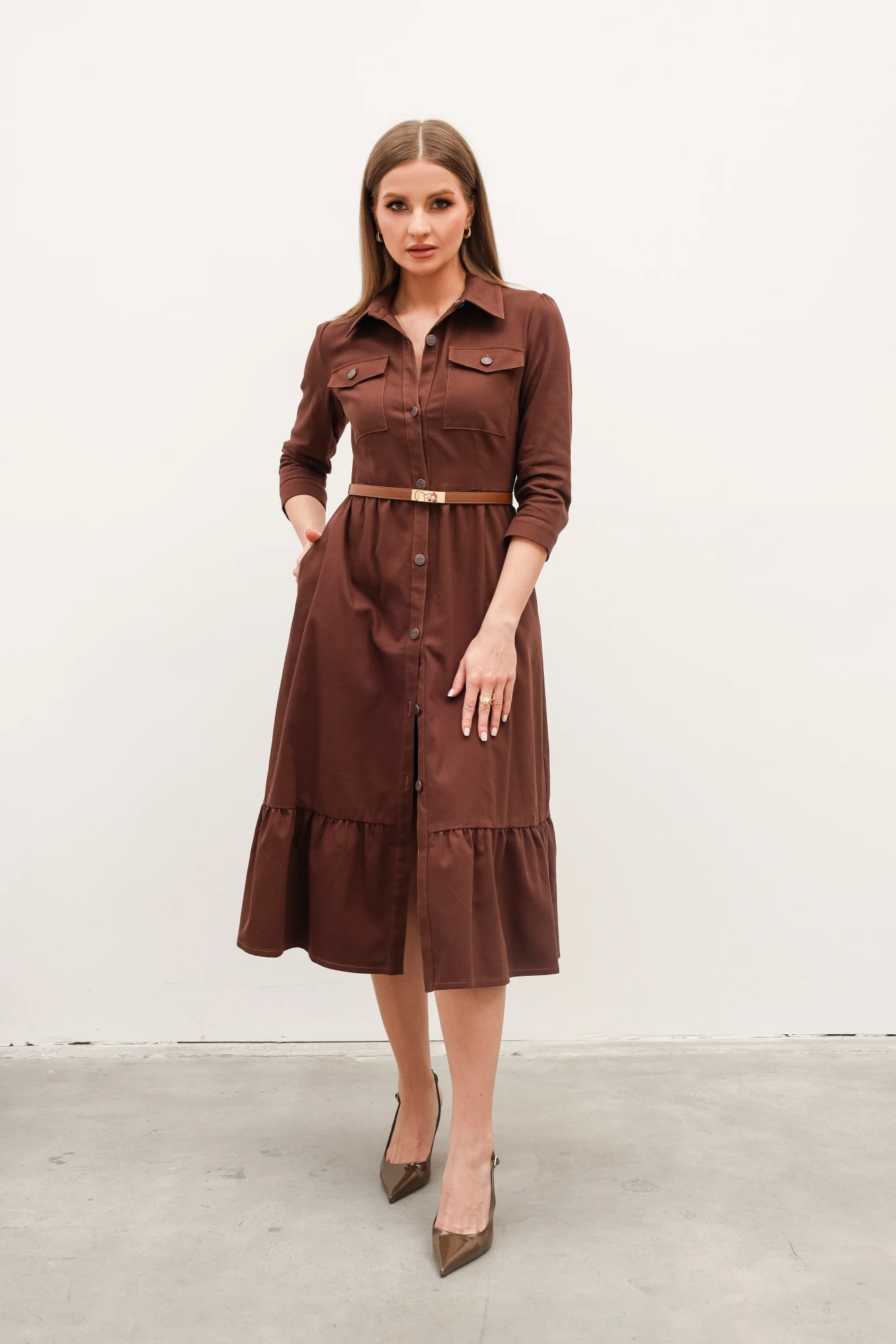 карманами с клапанами. Юбка А-образного силуэта, с воланом по низу.
