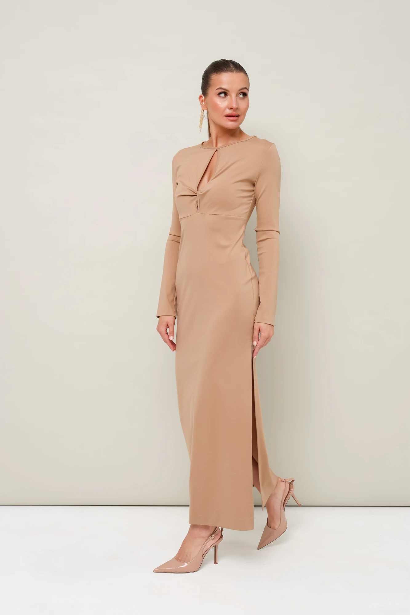 "Платье прилегающего силуэта в длине миди, выполнено из эластичного трикотажного полотна. Горловина округлой формы с вырезом «капля». На лифе обработан декоративный узел с подрезом под линией груди. Рукава длинные втачные. В боковом шве высокий разрез. Спинка со средним швом.