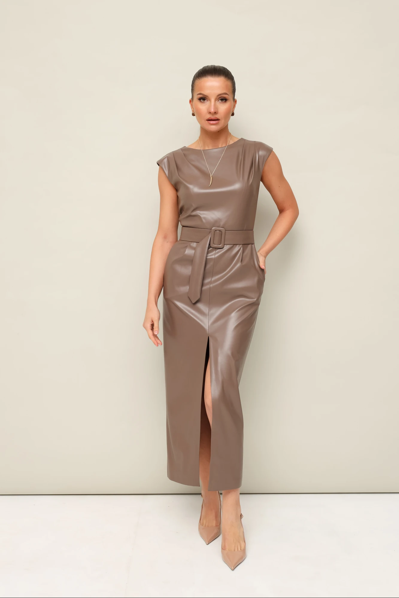 Стильное платье отрезное по линии талии в длине миди, выполнено из экокожи. Округлый вырез горловины. По плечевым швам лифа и по талии обработаны защипы. Юбка со средним швом, переходящим в разрез. Спинка в V-образным вырезом. В среднем шве застёжка на потайную тесьму молнию. В комплекте прилагается пояс из основной ткани с обтяжной пряжкой.