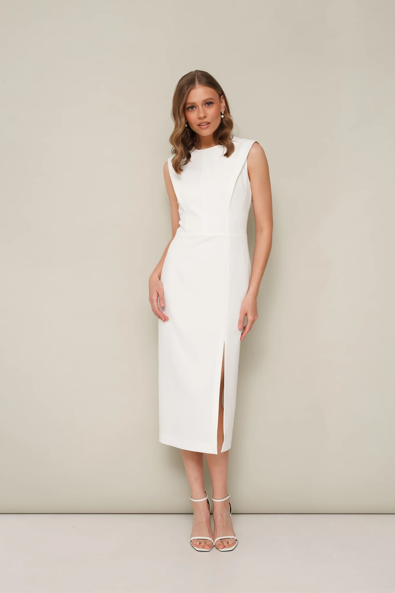 Лаконичное платье прилегающего силуэта, отрезное по талии, выполнено из плательной ткани. Округлый вырез горловины. Лиф по переду и спинке с конструктивными складками в рельефах. Юбка с высоким разрезом по левой стороне. Застежка в среднем шве спинки на потайную молнию. Платье обработано подкладкой.