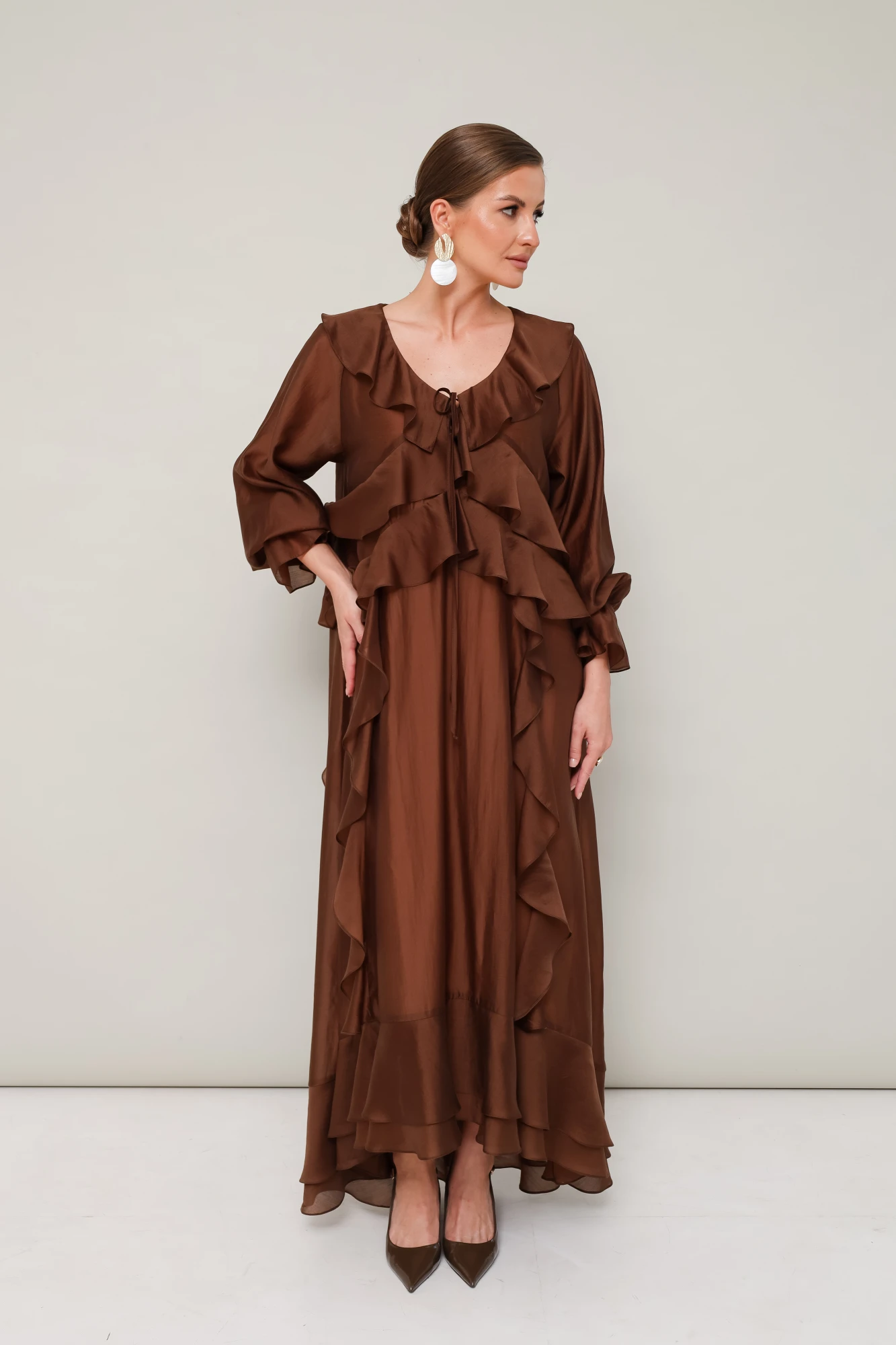 Летящее платье А-силуэта, выполнено из полупрозрачной вискозной ткани. Горловина с V-образным вырезом-каплей с завязками. Лиф переда с подрезами с воланами, переходящими на спинку. Юбка с вертикальными подрезами с воланами. Рукава-реглан с манжетами на резинке. Низ фигурной формы. Платье обработано подкладкой.