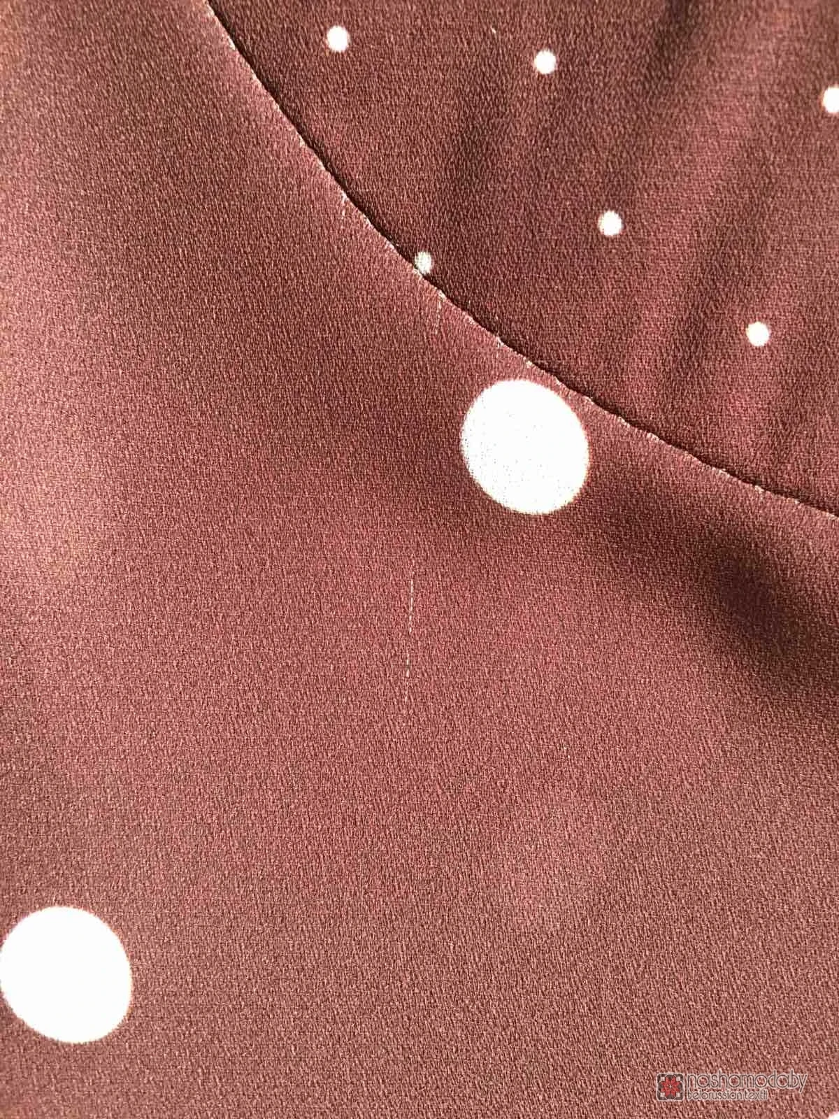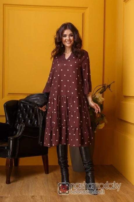 Платье женское, французский креповый шифон- на шоколадной основе-мелкие и крупные горохи. Платье- пышное, прямого силуэта, средней длины . Лиф переда и спинки платья- цельные. По юбке ниже талии -три ряда собраных в сборку воланов. В горловину вставлена вставка по переду V- образной формы, по спинке - овальной , обтачана обтачкой. Рукав -одношовный, втачной, 3/4 длины. По низу рукава -широкая рюша.