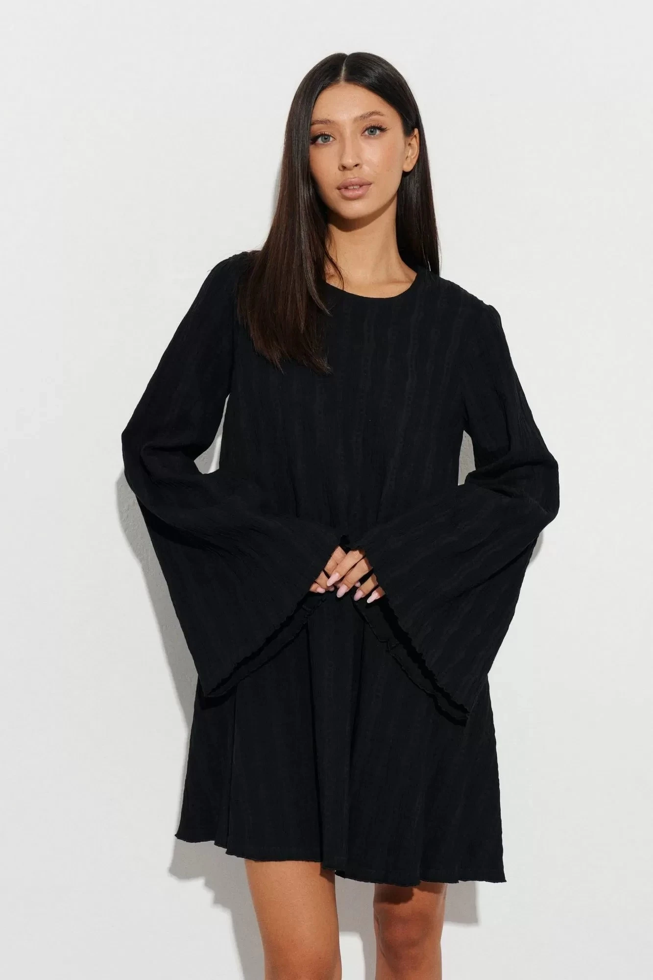 Платье свободного кроя выполнено из фактурного полотна черного цвета. Характеристики: А-образный силуэт, горловина овальная, застежка пуговичка петля по спинке изделия, рукав втачной с разведением к низу, низ изделия и низ рукава обработаны ролевым швом. Длина по спинке 84 см, длина рукава 69 см.
