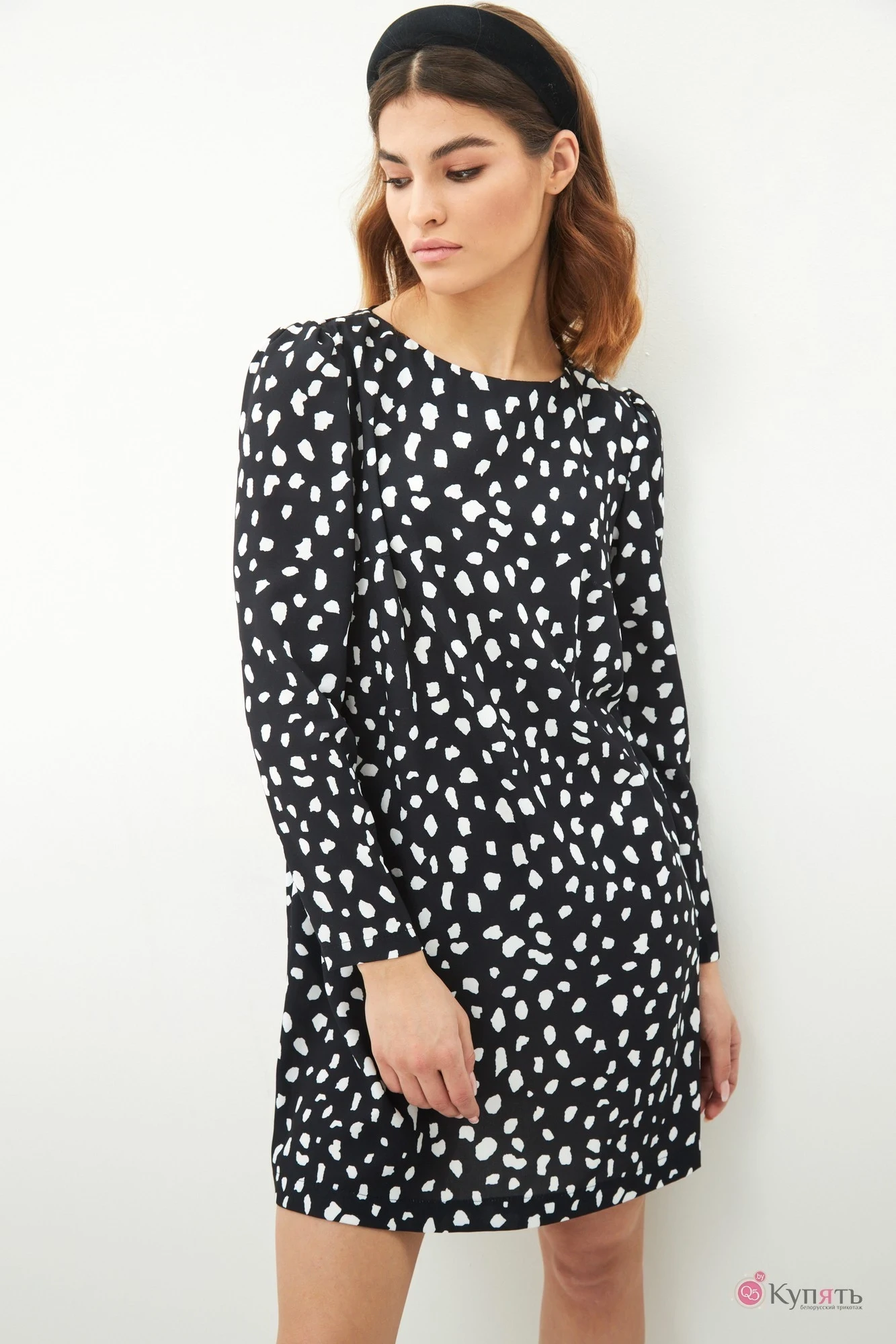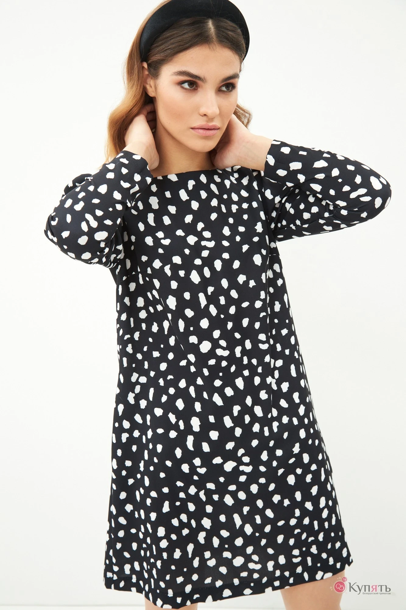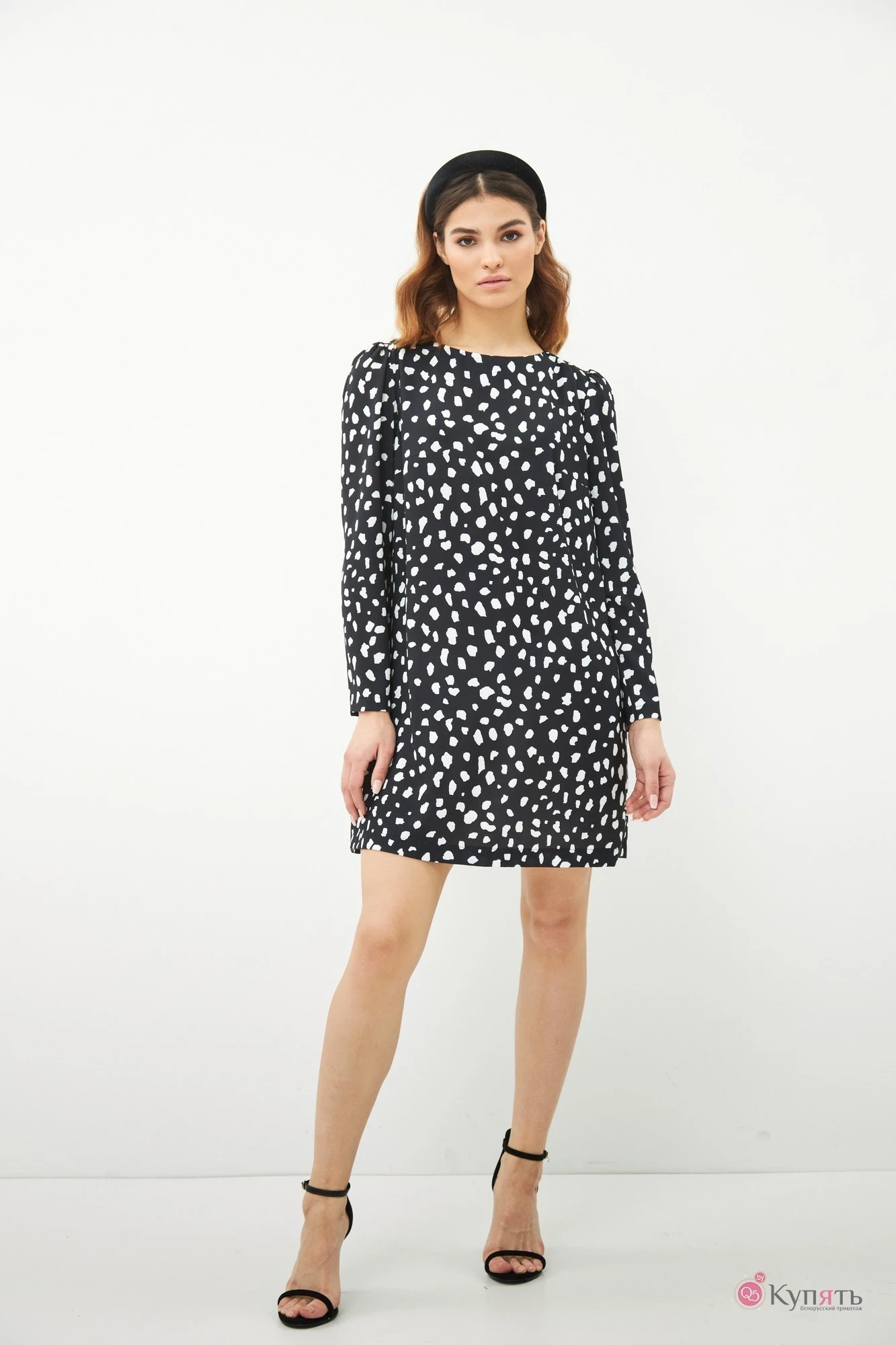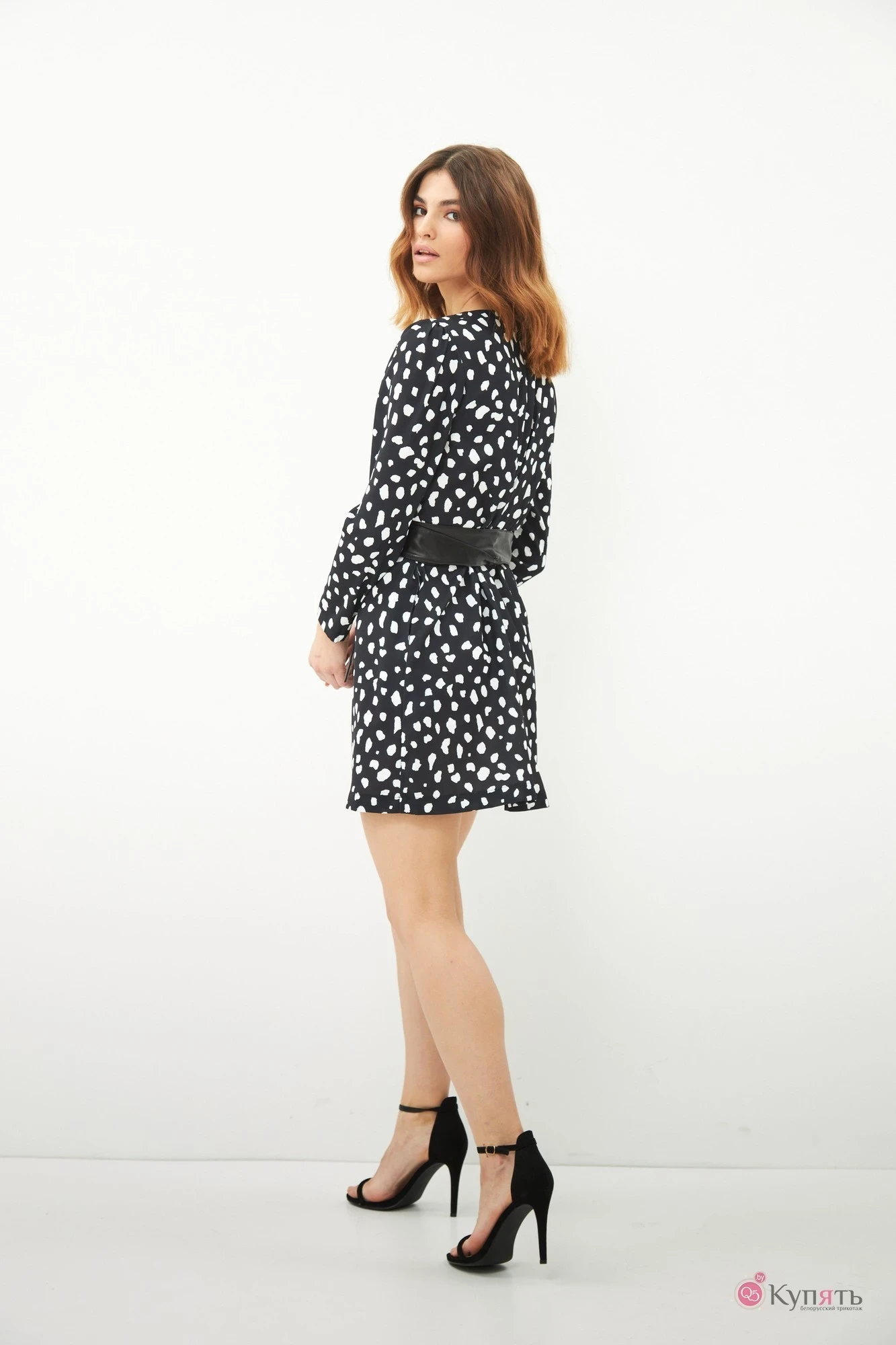 Платье с принтом прямого силуэта. Круглый вырез горловины, длинный рукав с оборками по окату, съемный пояс из эко кожи. Застежка на потайную молнию.