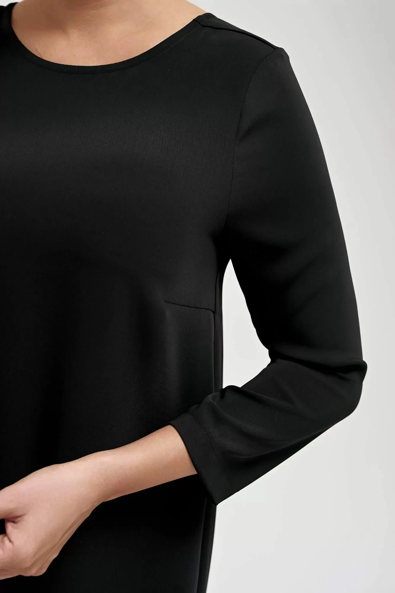 Женское платье свободного силуэта длины миди выполнено из легкой струящейся ткани со втачными рукавами и округлым вырезом горловины, по спинке - декоративный вырез и фиксирующие завязки, по низу - разрез.