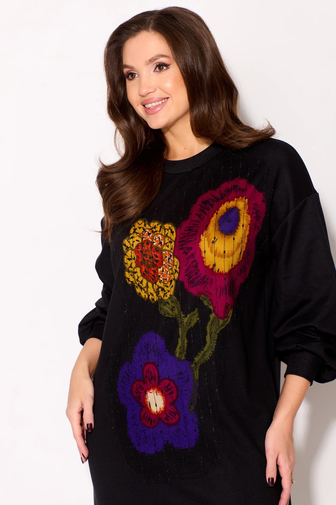 Платье (туника) свободного силуэта из трикотажной ткани с принтом. Рукав втачной одношовный со складками по низу и манжетой. Горловина обработана планкой. По переду поверх принта настрочена сетка Длина платья - 93 см, длина рукава платья - 53 см.