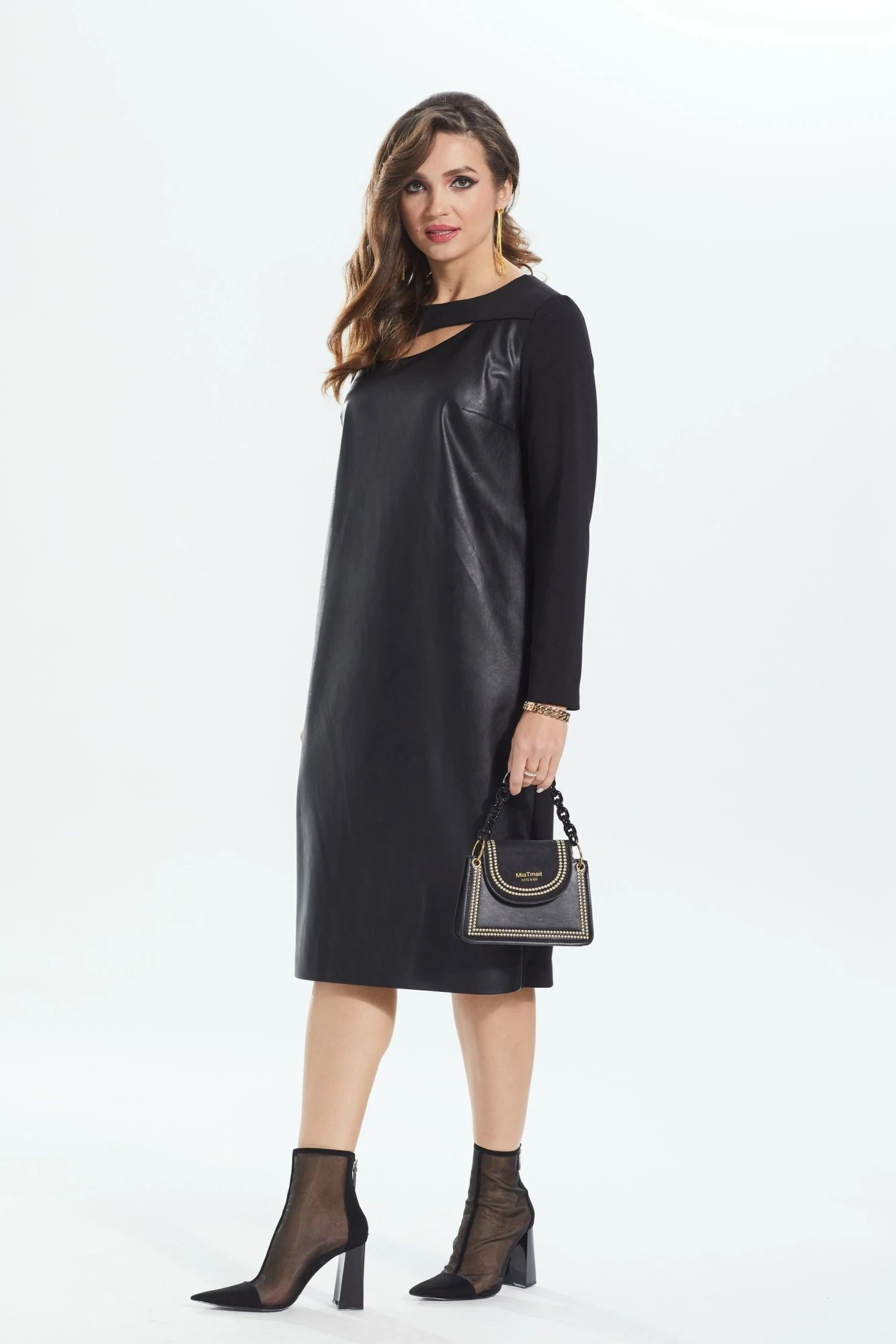 Платье из трикотажного полотна прямого силуэта со средним швом по спинке, оканчивающимся шлицей. Перед из эко-кожи с нагрудными вытачками и фигурной декоративной прорезью. Рукав длинный. По спинке застежка молния.