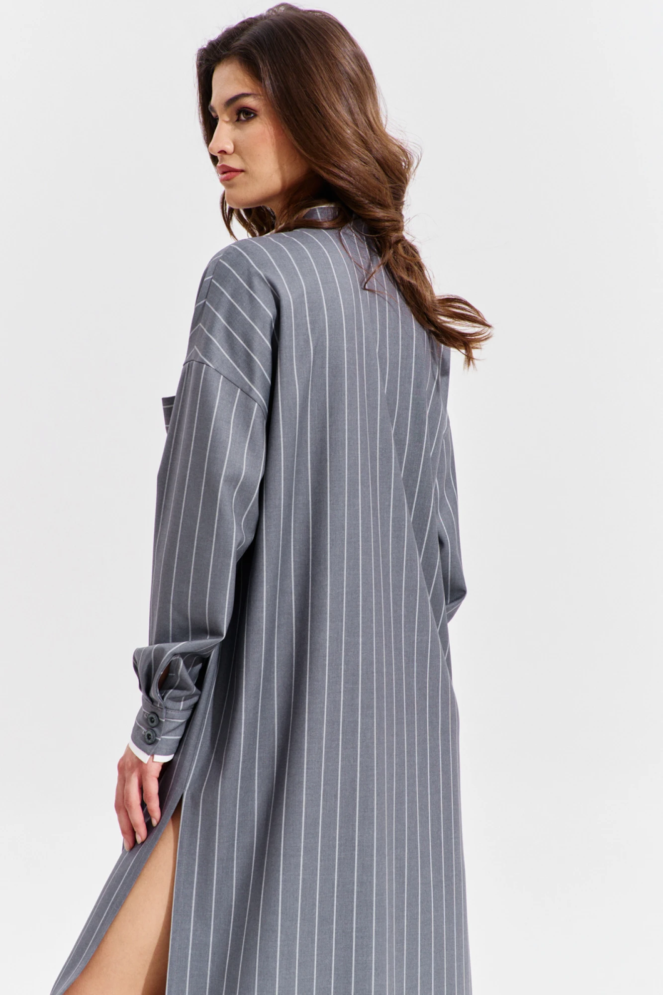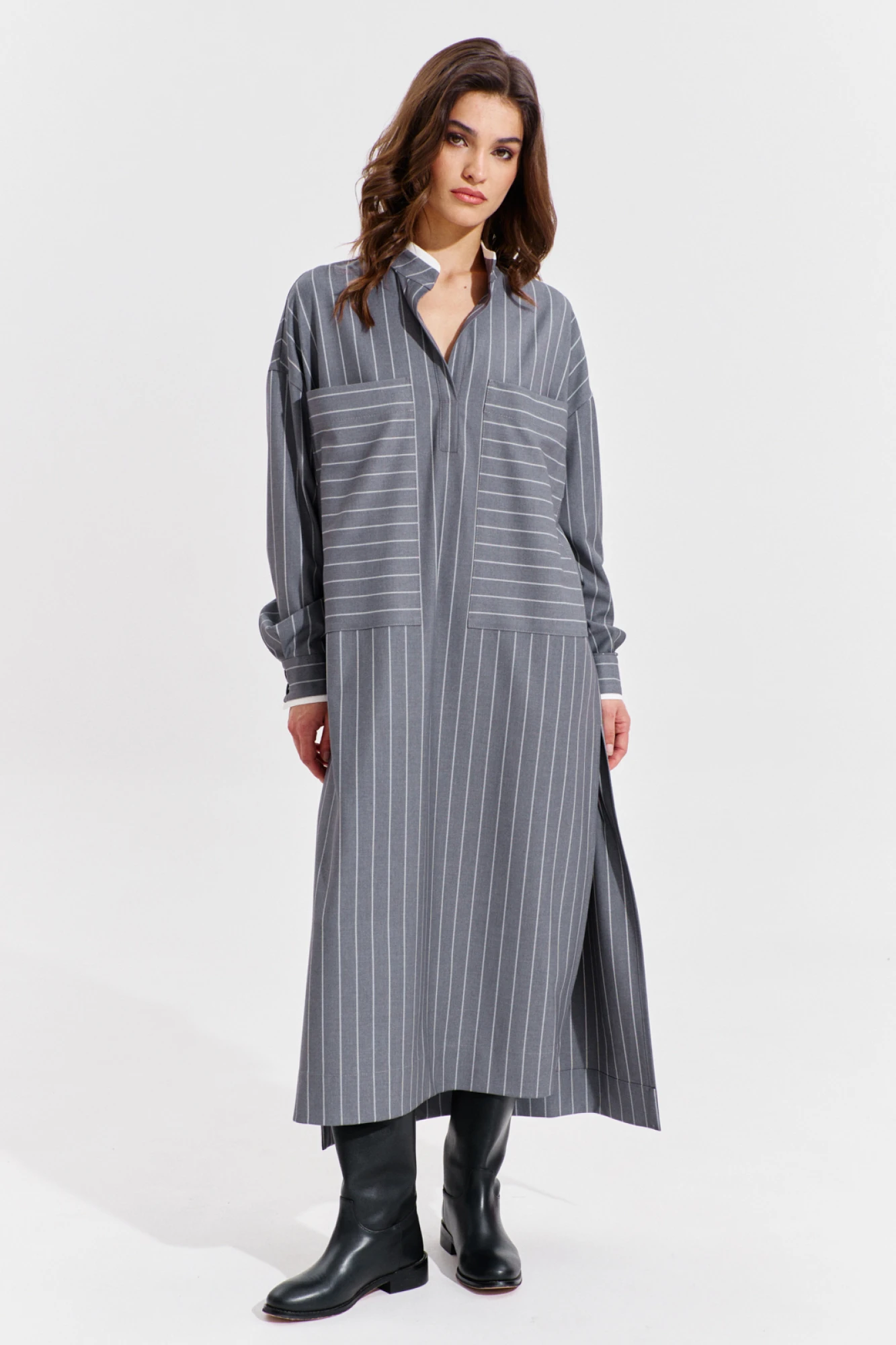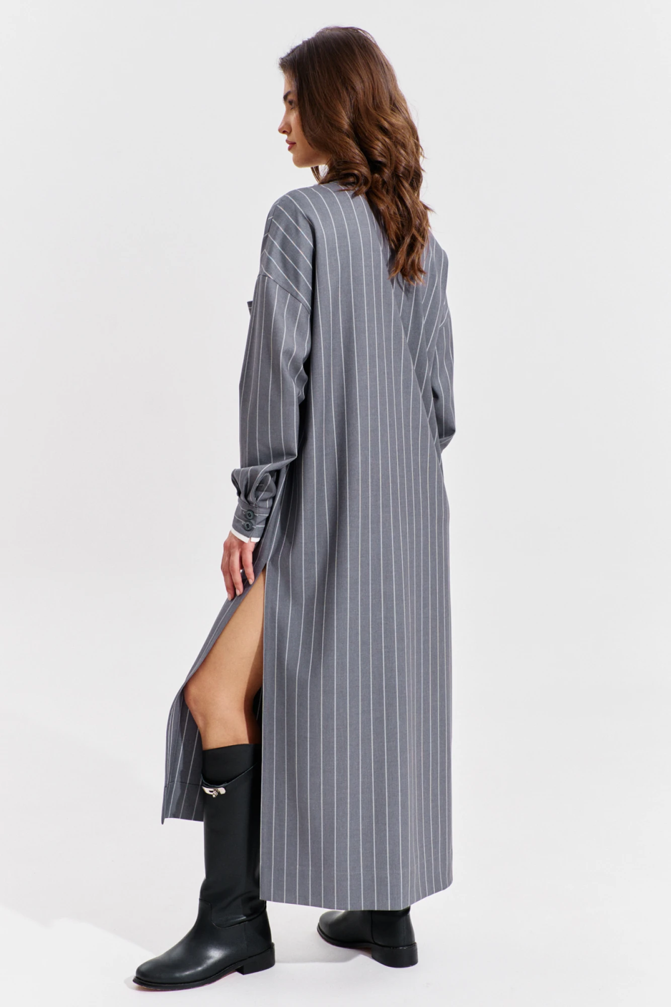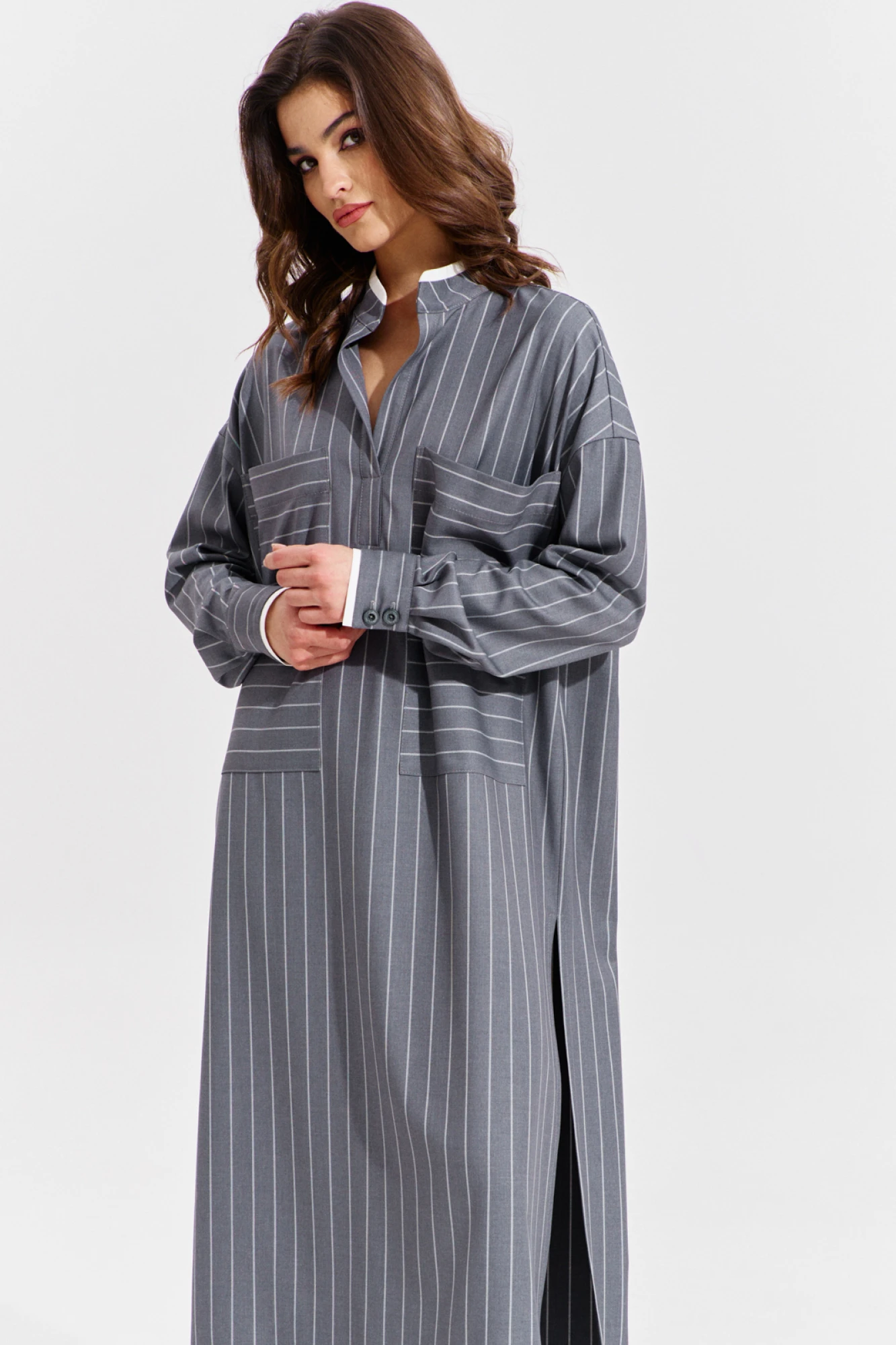 Платье кроя «оверсайз», длиной макси, спинка удлинена. По переду застежка поло с планками, накладные карманы. По боковым высокие разрезы. Линия плеча спущена, рукава одношовные, втачные, длинные. По низу рукава обработан разрез, складки и притачная манжета. По горловине стойка. По манжете и стойке кант из отделочной ткани.