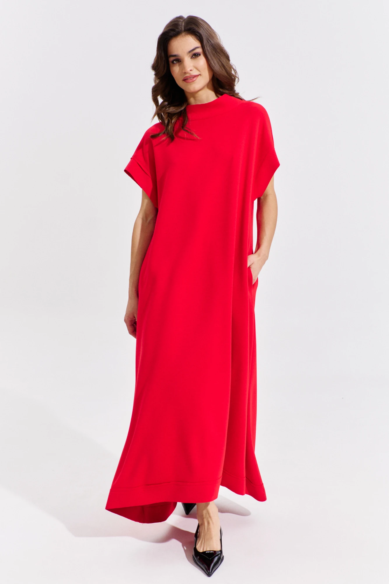 Платье свободного кроя, расширенное к низу, длиной до щиколотки, с неровной линией низа (по переду укороченное). Рукава цельнокроеные, короткие с притачной манжетой. В боковых швах обработаны карманы. Горловина округлой формы со стойкой.