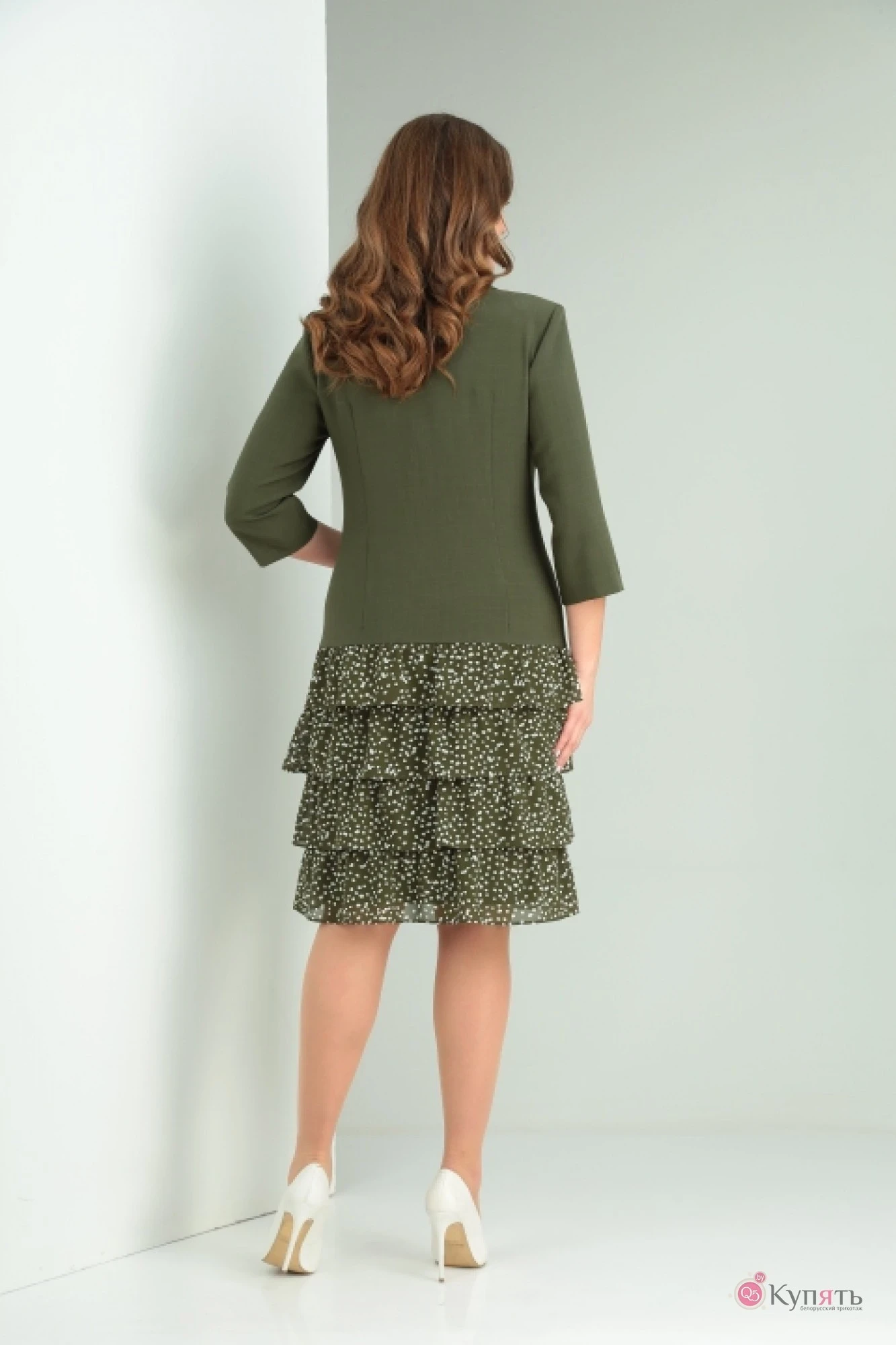 Платье прямого силуэта, двубортное с застежкой донизу на петли-пуговицы. Перед с рельефом . Горловина с отложным воротником и лацканом. По спинке идут талиевые выточки. От линии бедра до низа платья настрочены воланы из шифона. Рукав втачной, 3/4, одношовный
