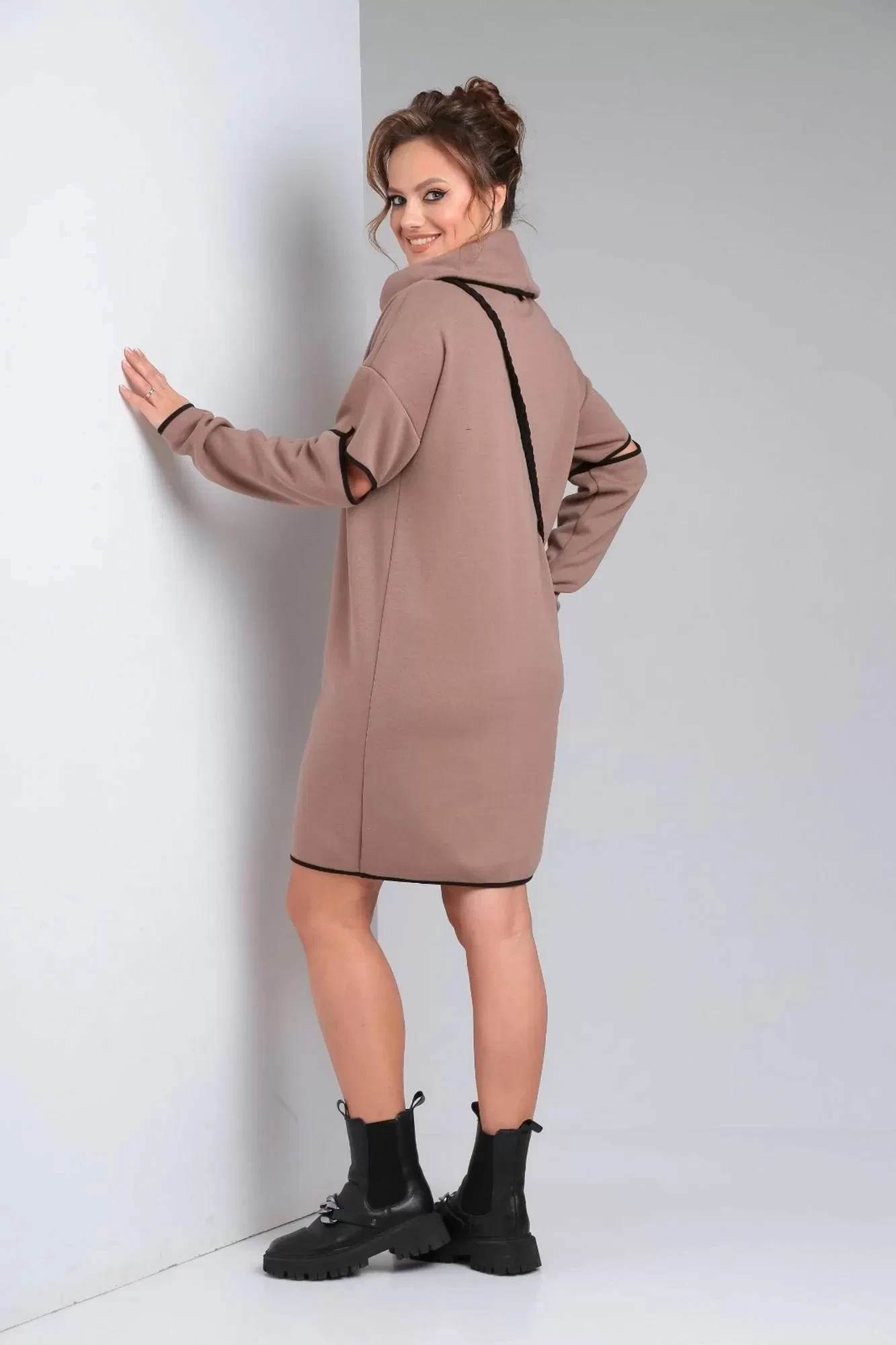 Платье женское 2-х предметное, прямого силуэта. Воротник- стойка отложной на пуговицах, съемный. Плечо спущенное, рукав удлиненный. В локтевой части декоративный элемент- отрезной рукав на пуговице. Сумочка-котик для телефона на застежке-магнит. Ремень-плетеная косичка.