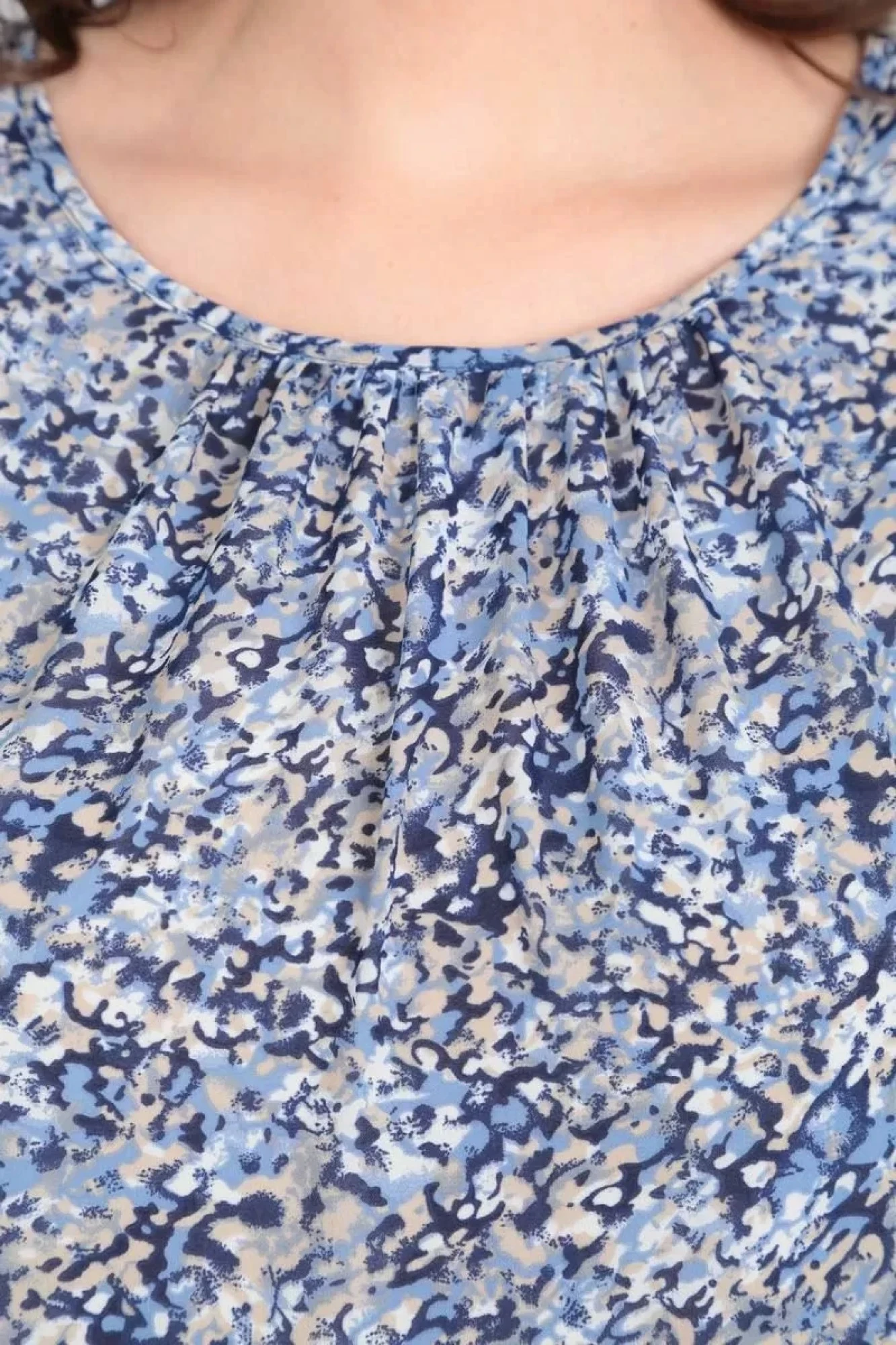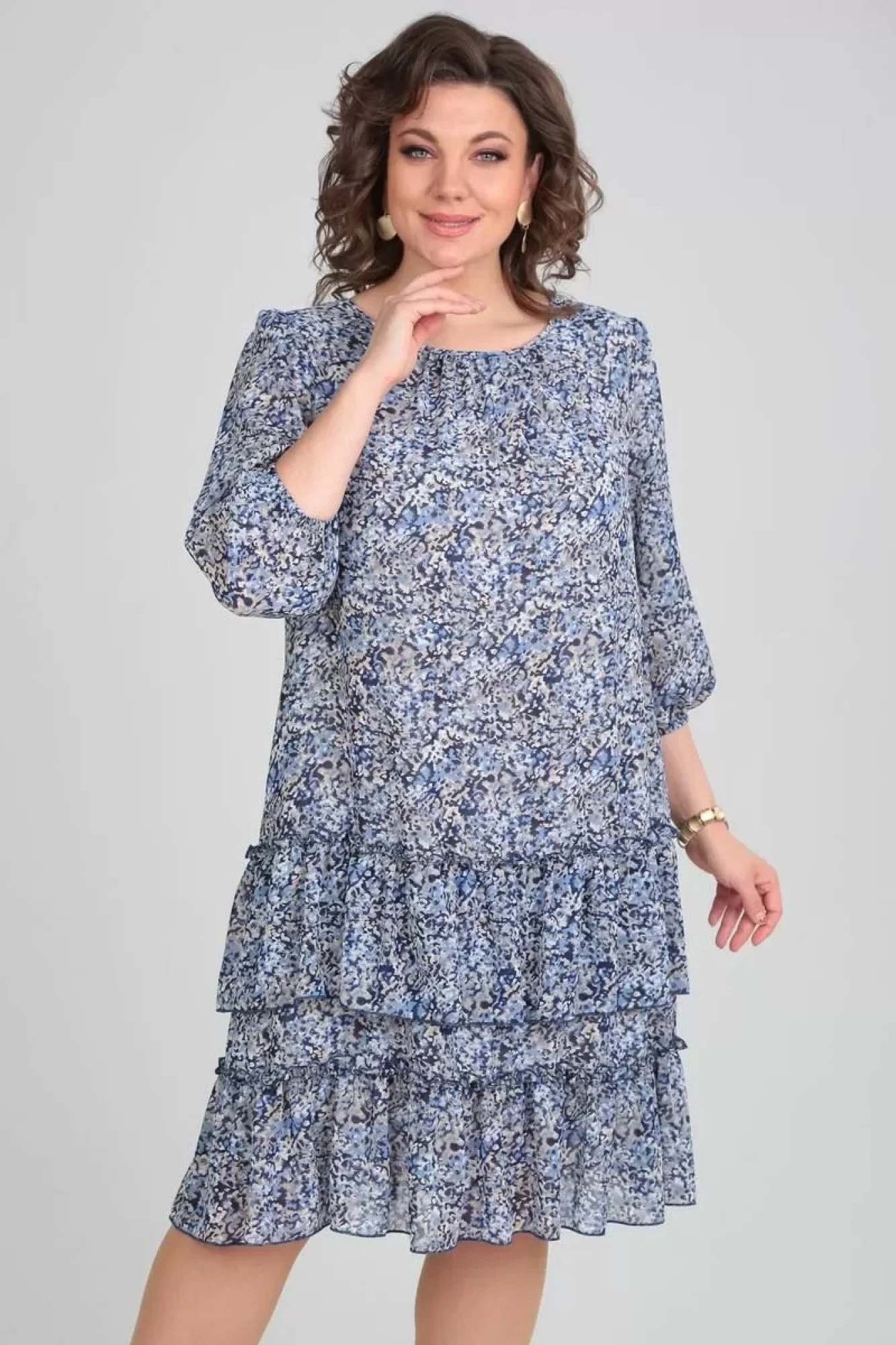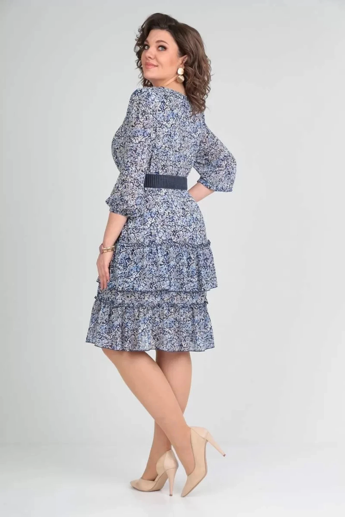 Платья свободного кроя,с округлой формой горловиной, с нагрудными вытачками. Втачной, одношовный рукав,низ рукава застрочен под резинку,рукав чуть ниже локтя. У нижней части платья​ два настрочных,присборенных волана.К платью так же идёт декоративный пояс.