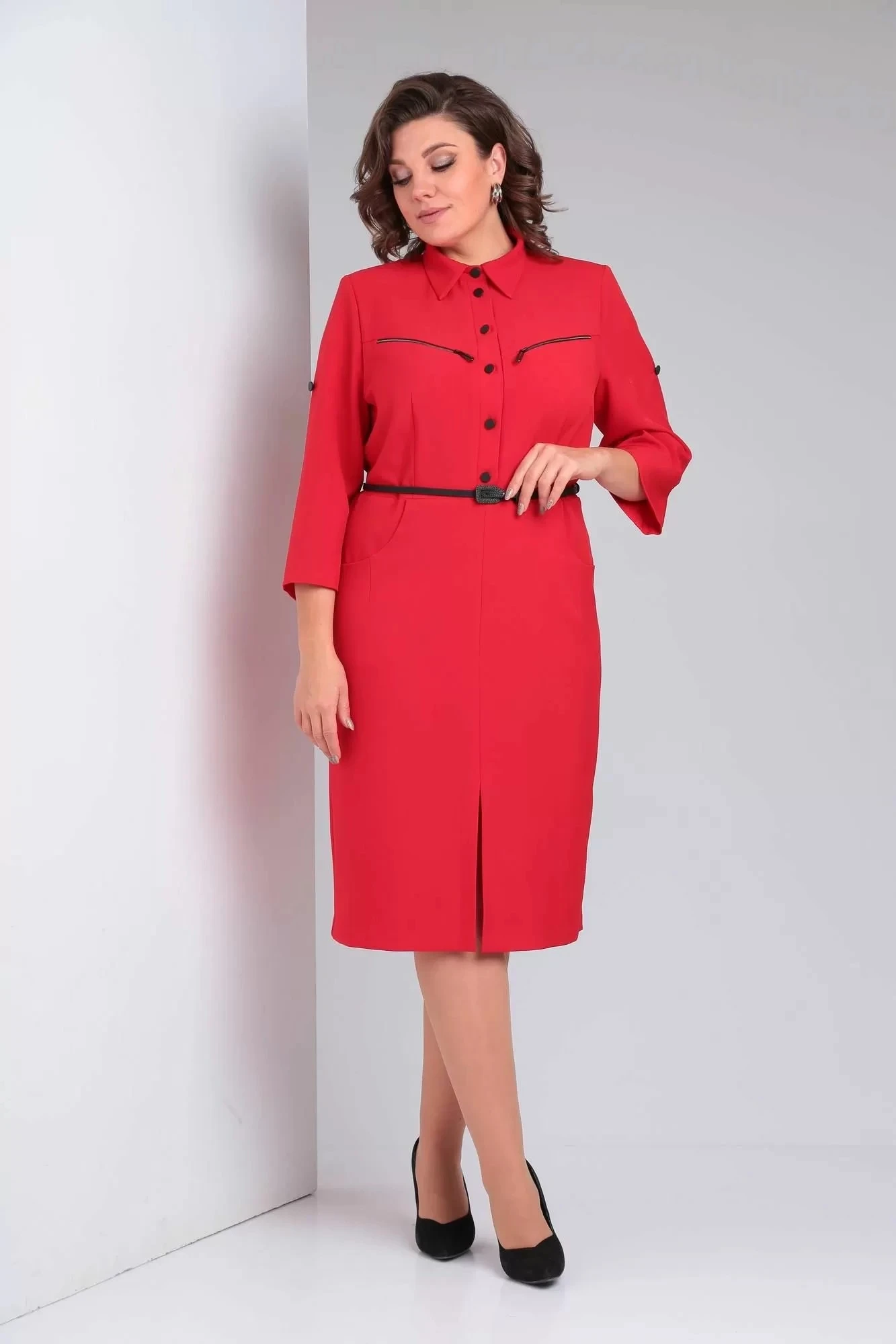 Платье прямого силуэта из плательной ткани хорошо маскирует изъяны и подчёркивает все прелести фигуры. Горловина оформлена отложным воротником на стойке. По переду выполнена планка с застежкой на петли и пуговицы. В нагрудных кокетках вшиты декоративные молнии, подчёркивая красоту линий. Модель отрезная по линии талии, в боковых швах закругленные карманы. По центру шва разрез, который добавляет особый шарм. Рукав 2-х шовный втачной 3/4 с патой. В жаркое время рукав можно поднять вверх и закрепить плату на пуговицу. Пояс подчёркнет линию талии и образ классический превратится в модную, стильную, стройную модель.