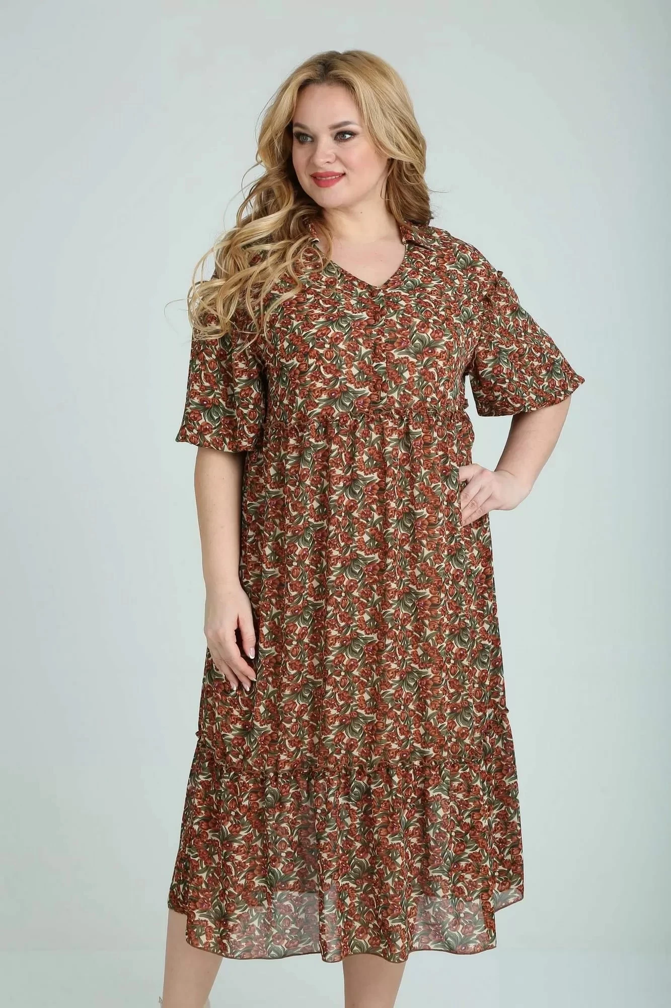 Платье женское 2-х предметное состоящие из шифона свободного кроя и платья-комбинации. Лиф переда с центральной застежкой на петли пуговицы. Вырез горловины V-образный с отложным воротником. Линия плеча приспущена с притачным рукавом на подкладке. К лифу притачены два объемных волана. Платье дополняет съемный пояс, который можно использовать в качестве галстука и банта.