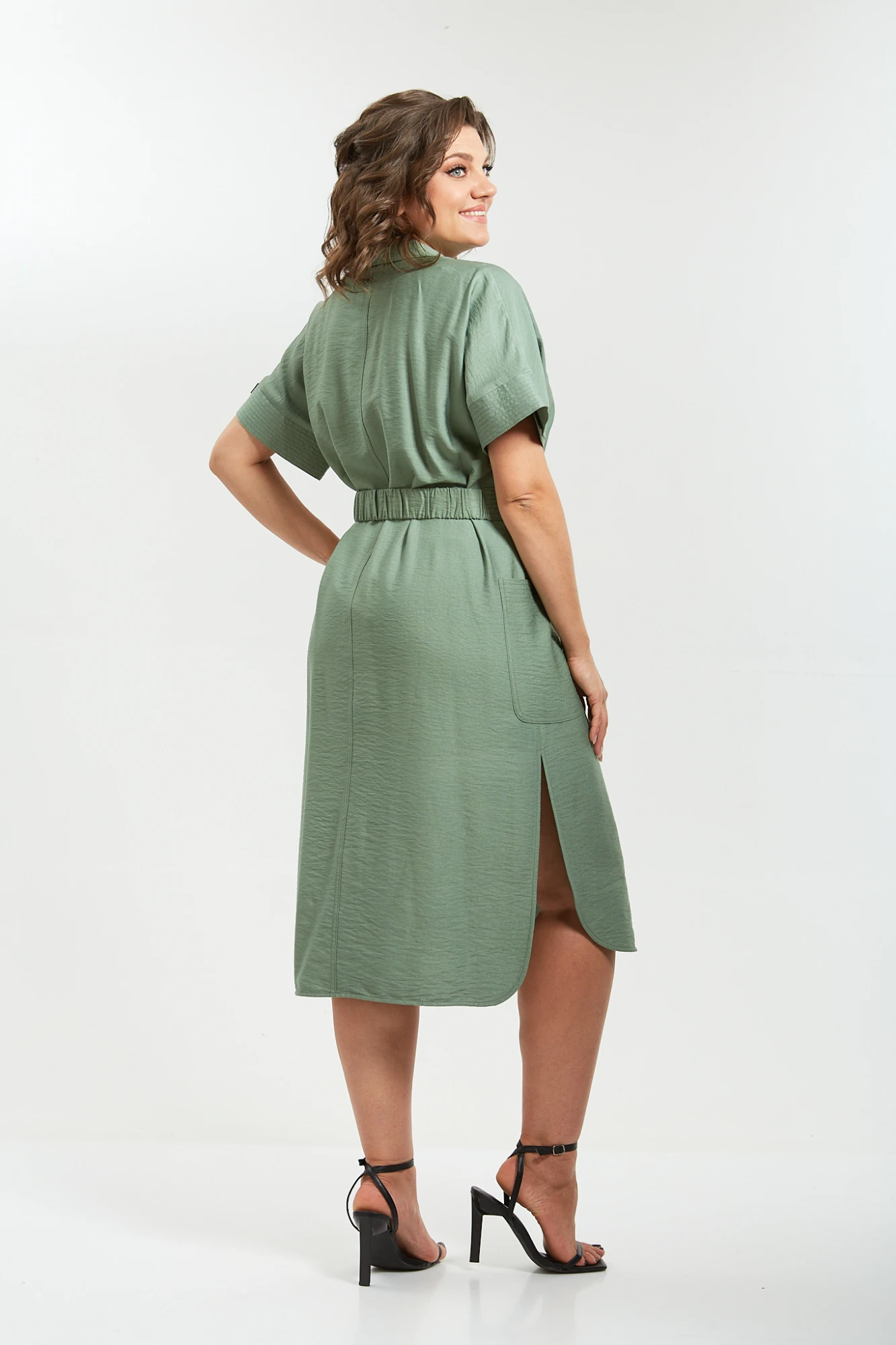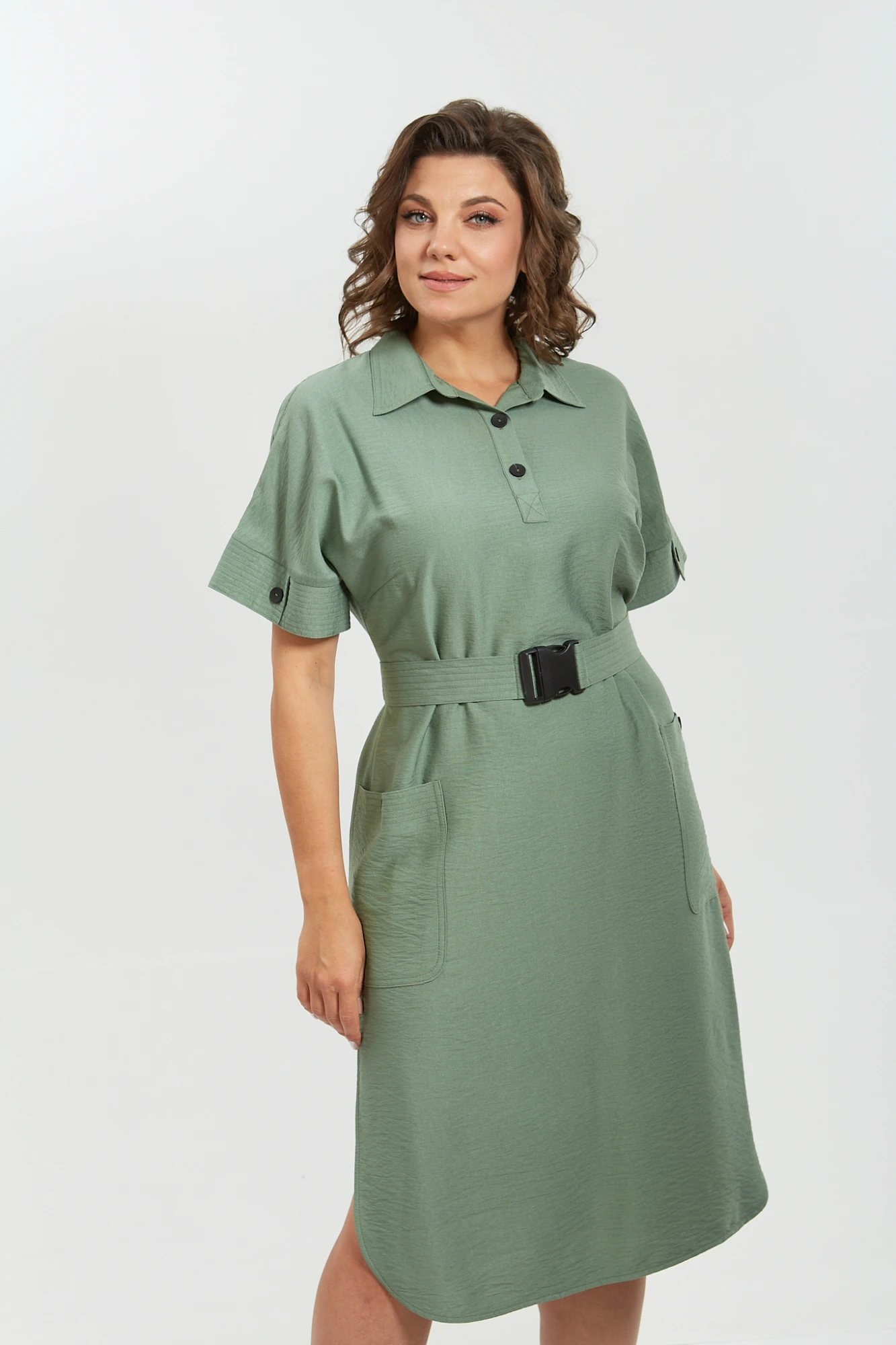 Платье женское прямого силуэта. Перед с нагрудными выточками и накладными карманами, которые застегиваются на петлю-пуговицу. Рукав цельнокроеный с притачной манжетой. Горловина оформлена втачной планкой на петли-пуговицы и рубашечным воротником на стойке. Спинка прямая со средним швом. Низ платья фигурный, а разрезы по бокам делают образ более динамичным. Платье дополняет съемный пояс на резинке.