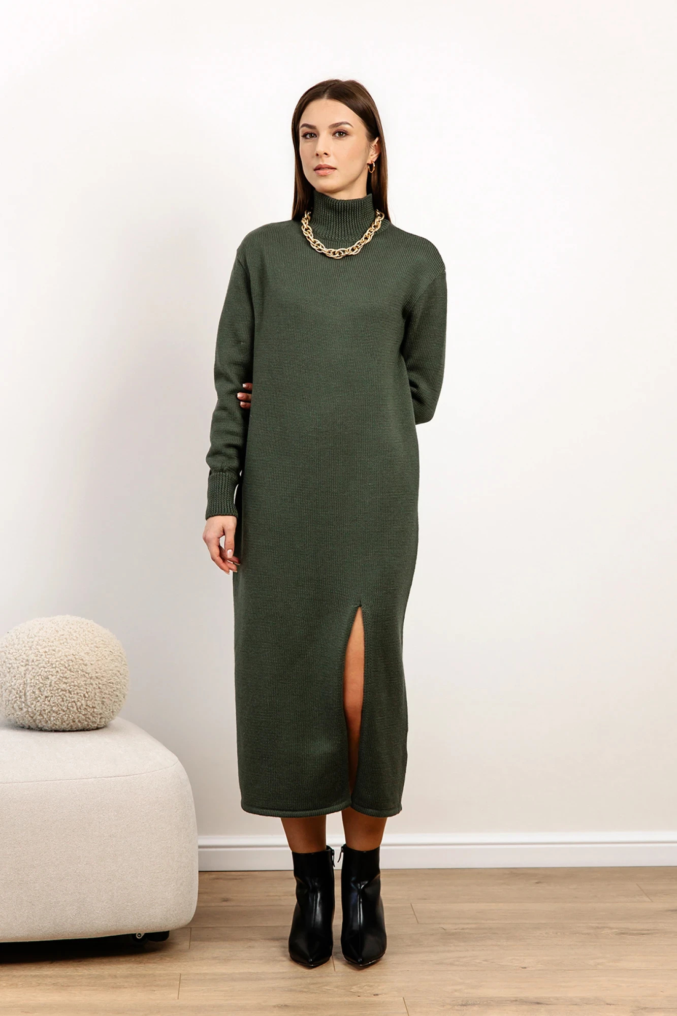 Длинное вязаное платье с разрезом. Уютное и теплое платье из мягкого трикотажа с шерстью и воротником-стойкой. Прямой силуэт позволяет скрыть недостатки фигуры и подчеркнуть достоинства. В нашем платье Вы будете чувствовать себя комфортно и защищенно. К тому же, платья Romgil, как отличные базовые элементы гардероба, легко сочетается в повседневном, офисном и классическом стиле. Идеально подходит для повседневной носки. Платье приятное к телу и легкое в уходе, после стирки - не линяет, не изменяет форму. Для того, чтобы трикотажная одежда радовала вас как можно дольше важно обратить внимание на уход за ней: стирать при температуре не выше 30 градусов в щадящем режиме, сушить в горизонтальном положении, гладить в режиме отпаривания, появившийся пилинг удалять с помощью специальной машинки.