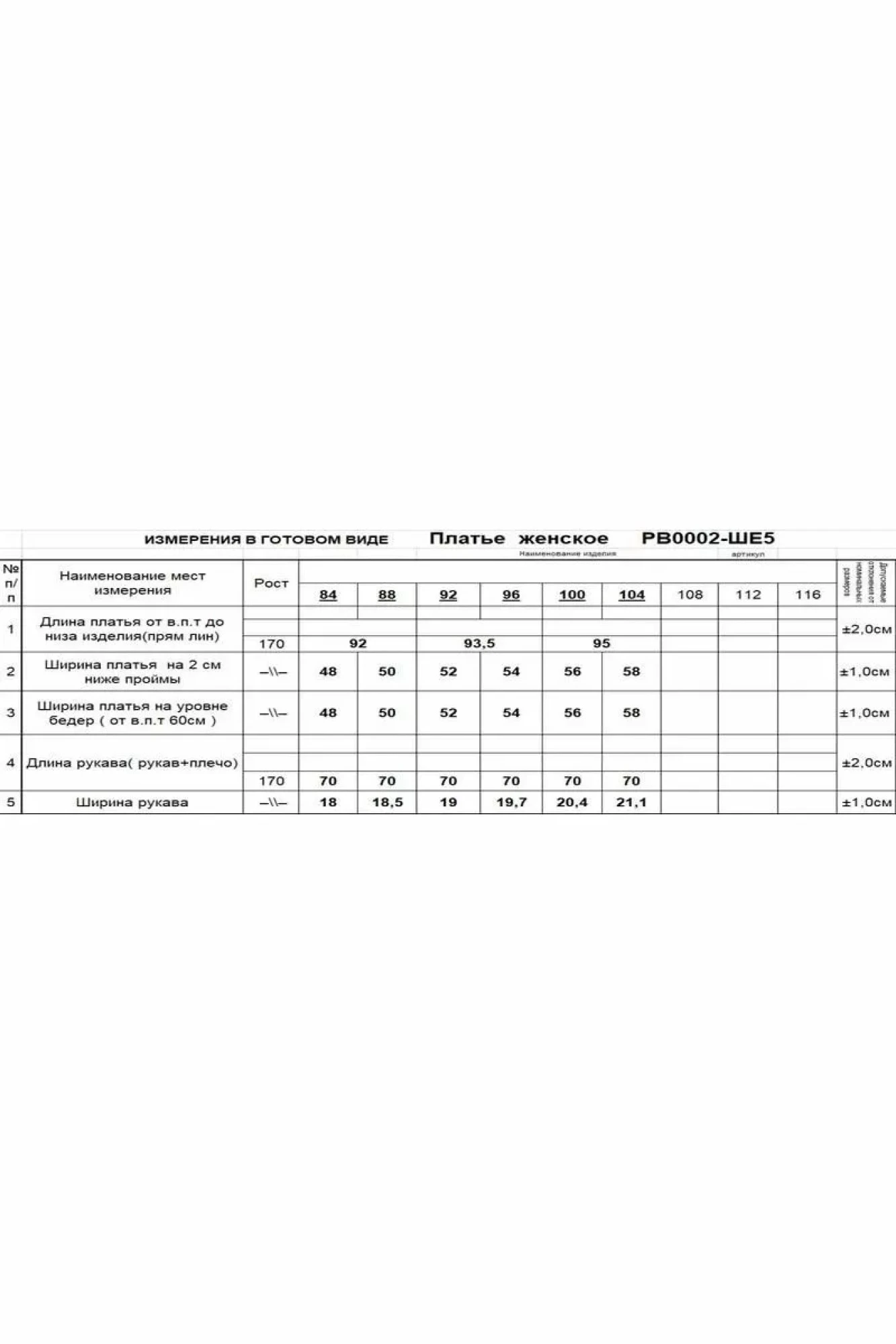 Таблица размеров