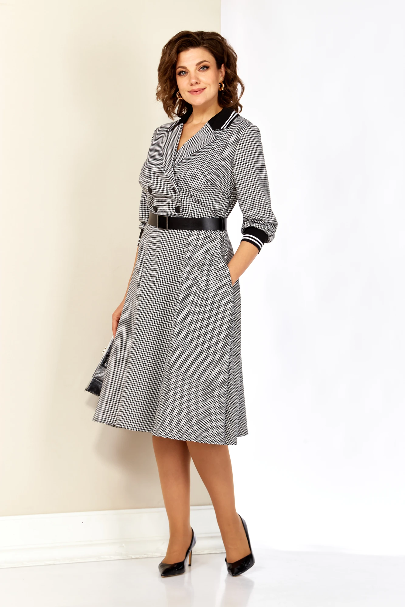 Женское элегантное классическое платье из костюмно-плательной ткани с рисунком «Гусиная лапка». Платье полу прилегающего силуэта, отрезное по линии талии, расклешенное к низу. Лиф переда с двубортной застежкой и нагрудными вытачками, выходящими из боковых швов. Спинка с талиевыми вытачками по лифу. В боковых швах карманы . Воротник отложной. Современная модель с рукавам ¾ на манжетах, выполненных с эластичного материала (резинка-довяз). Платье с идеальной посадкой. Впишется в дресс-код и подойдет для офиса и школы. Поможет создать строгий и стильный образ. Сочетается с жакетами, куртками и пиджаками.