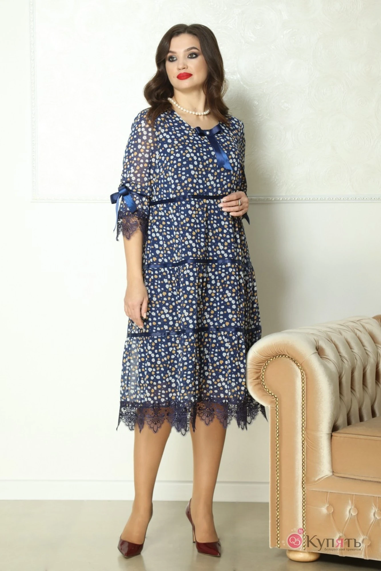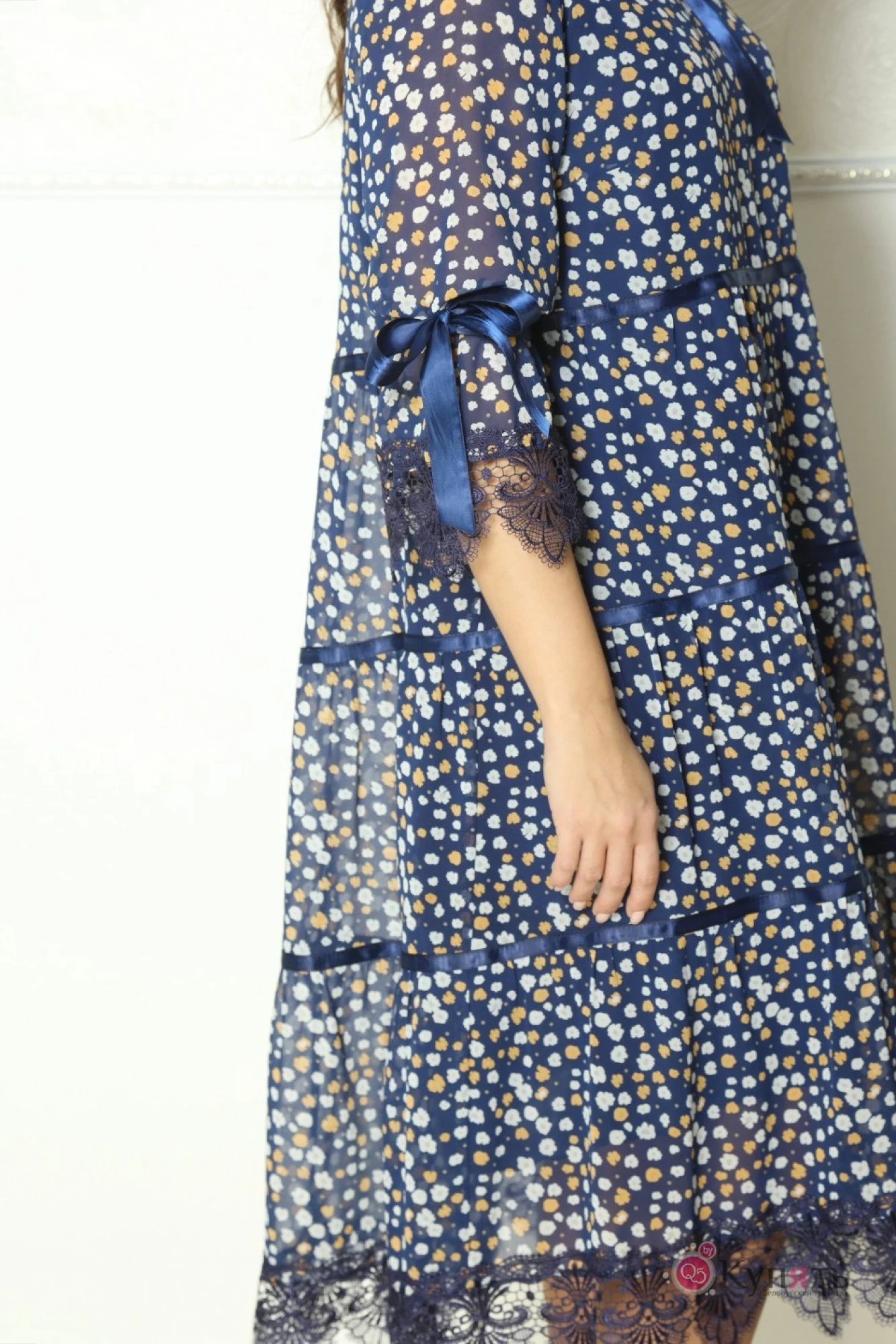 Платье женское из шифоновой ткани, подойдет для женщин любой возрастной категории, А-образного силуэта. По переду нагрудные выточки. Рукав втачной,3/4 свободного кроя, по нижней части рукава вставлена резинка-венгерка, которая закрыта с декоративным шнуром, который может завязываться. Низ рукава и изделия обработан кружевом. Горловина округлая, декорирована бантиком.Длина изделия в 50р-113см, длина рукава-49см.