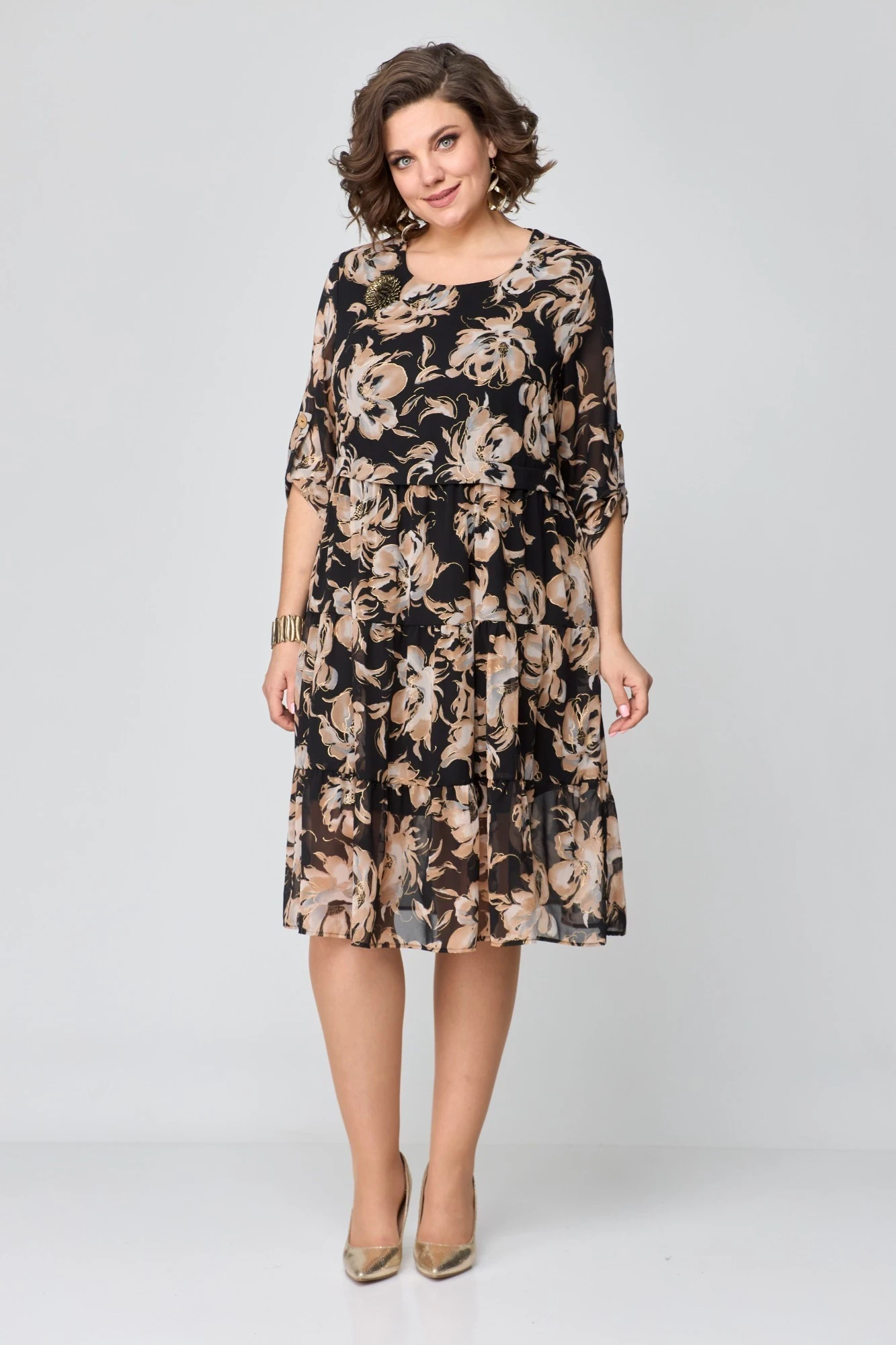 Легкое женское платье, выполненное из шифоновой ткани. Платье свободного кроя, отрезное по талии. Рукав ¾, длина рукава регулируется с помощью паты. Горловина округлая, на груди имеются нагрудные вытачки. Юбка состоит из воланов со средней сборкой. В боковых швах имеются карманы. Платье на подкладке. Длина платья по центру спинки 105 см. Длина рукава 49 см. Брошь в комплект не входит.