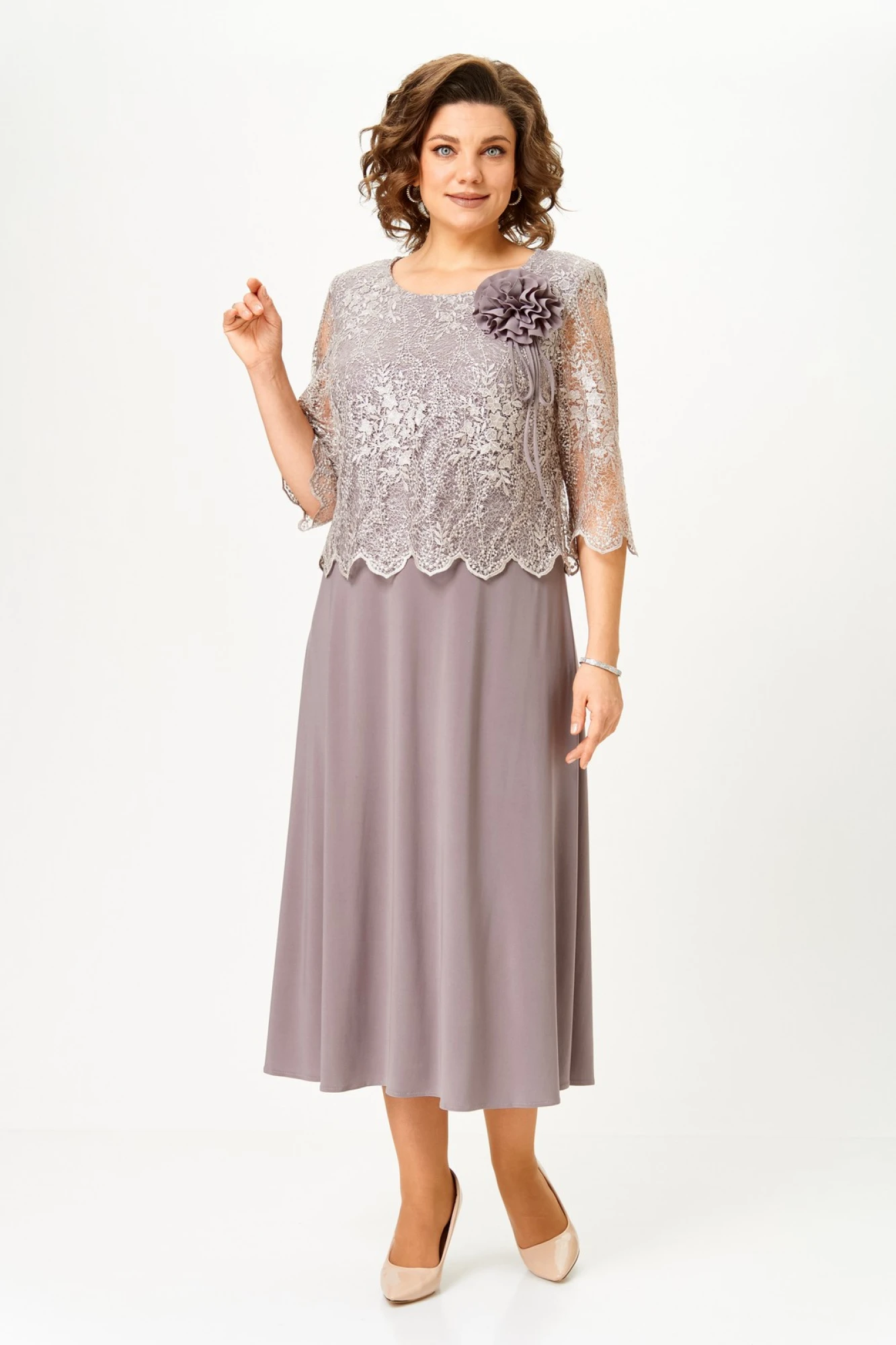 Платье женское полуприлегающего силуэта с расширением по низу. Платье выполнено как имитация комплекта. Верхняя часть платья и рукава из гипюра добавляют романтичности и легкости. По линии груди вытачки. Спинка со средним швом. Рукав втачной, длиной ¾. Украшением служит съемный цветок.