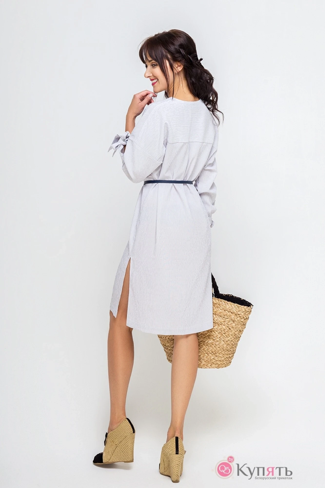 Платье женское, прямого покроя со спущенным рукавом. Ткань в мелкую синюю полоску, с эффектом жатки. По переду с левой стороны накладной карман. По спинке двойная кокетка, складка. Горловина по спинке обточная кокеткой. Застёжка на петли пуговицы. Рукав втачной, длина рукава 7/8, но низу рукава сборка. Низ рукава обработан притачной манжетой цельные с завязками. Длина платья по среднему шву 98 см (±1 см). По боковым швам разрезы. В комплекте съёмный пояс.