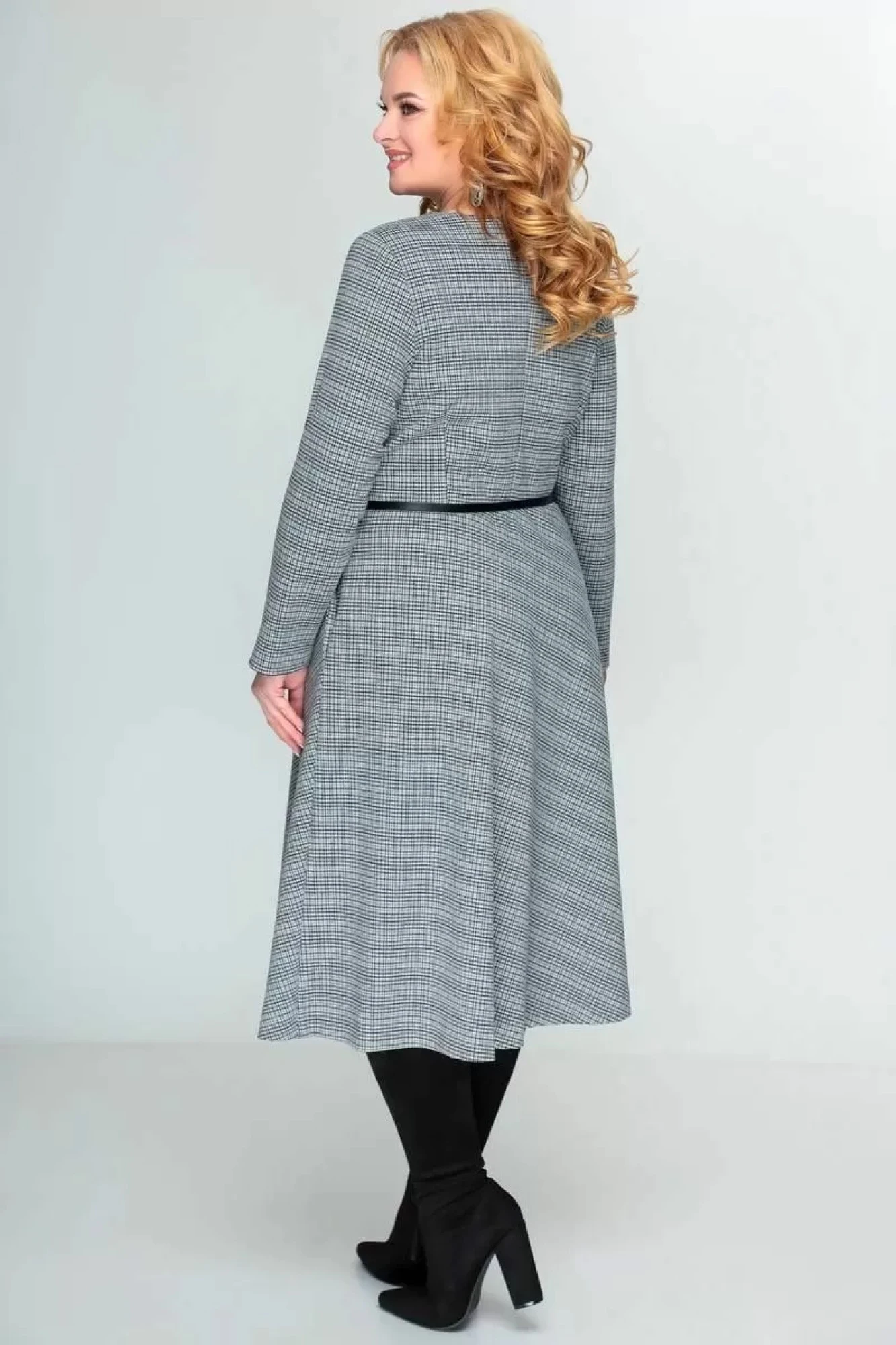 Платье женское полуприлегающего силуэта. Выполнено из трикотажного полотна. Платье отрезное по линии талии. По лифу переда расположены рельефы, по лифу спинки – талиевые вытачки. Нижняя часть платья А-силуэта. Спинка лифа платья со средним швом, в который вставлена потайная молния. Юбка платья переда и спинки цельнокроеные, выполнены по косой. В боковых швах юбки расположены карманы. Рукав втачной одношовный, длинный. В комплект входит ремень.