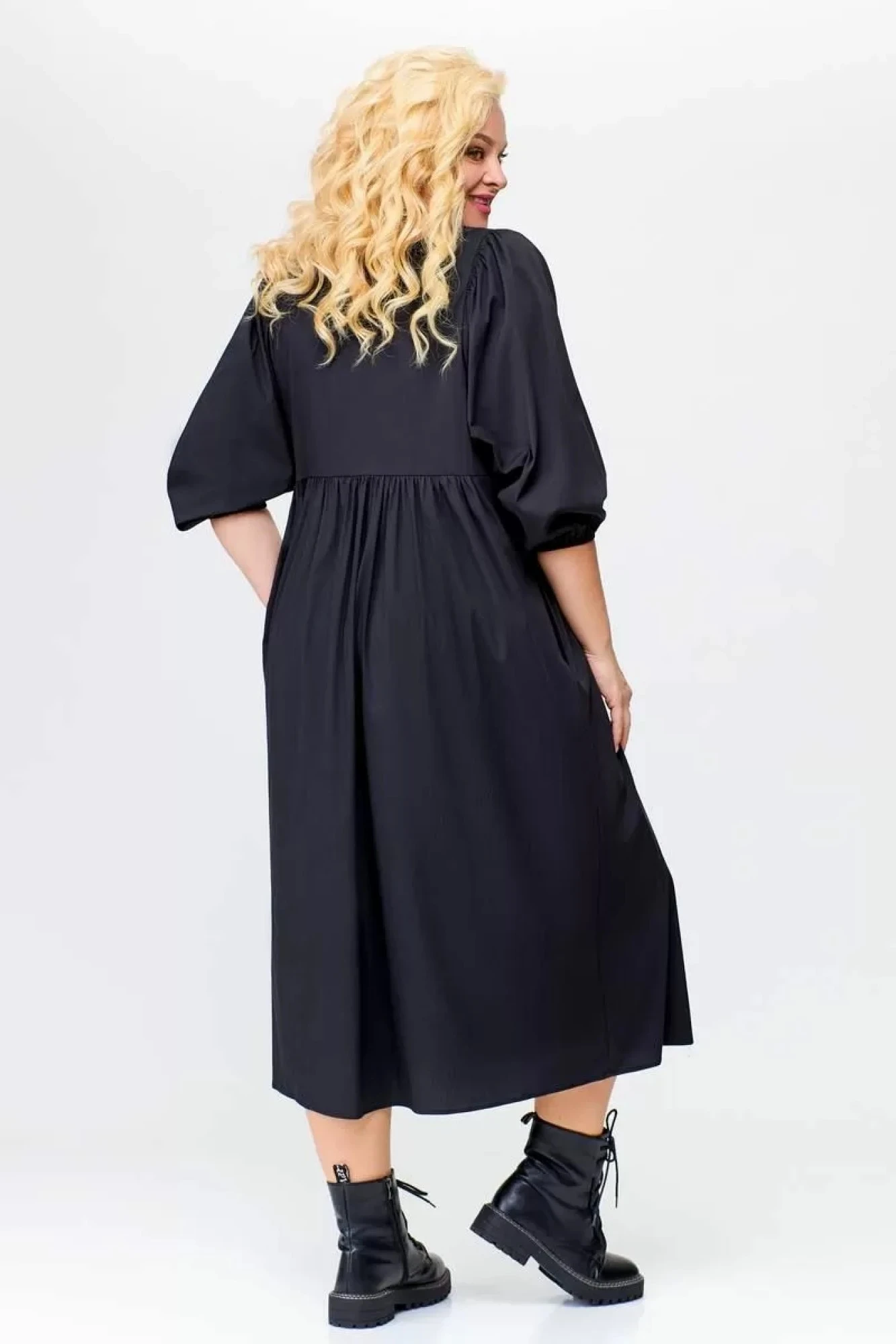 Платье отрезное по линии талии. Перед лифа со средним швом и разрезом с застёжкой по горловине на навесную петлю и декоративную пуговицу. Юбка со сборкой по линии талии и карманами в боковых швах. По низу юбки пришита фирменная эмблема «SWАLLOW». Рукав цельнокроеный, отрезной по линии проймы, со сборкой по окату. Низ рукава собран на эластичную тесьму.